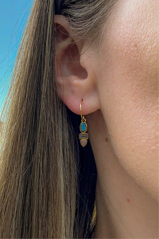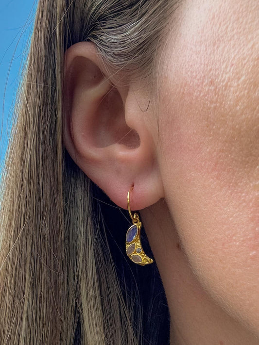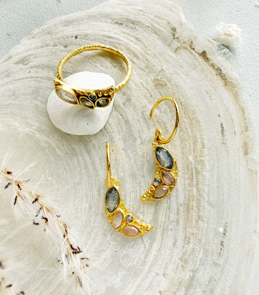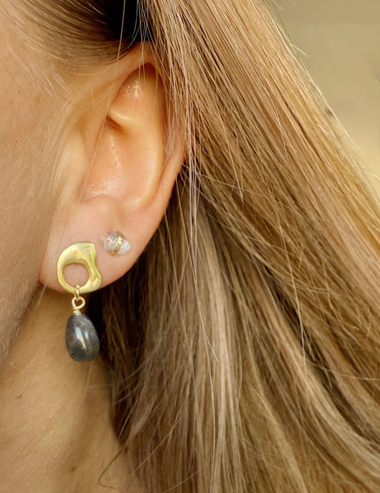 Earrings with labradorite, smoky quartz and peach moonstone crystals