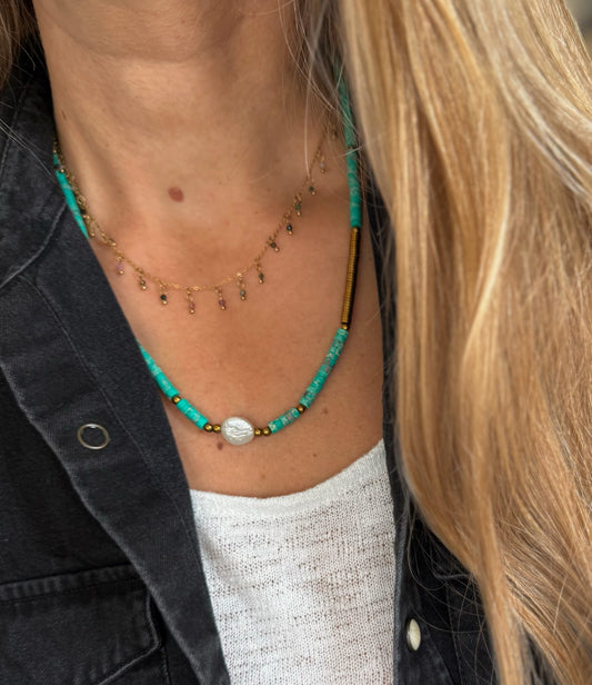 Turquoise crystal, called the stone of happiness. It brings success and love, harmonizes the body's chakras and meridians, helps the physical body find harmony with the spiritual. This stone speaks of liberation from suppressed emotions, helps to heal from traumas, to discover one's vocation and path in life. It is especially suitable for those who worry a lot, experiencing panic attacks - it relaxes, calms, softens emotions.
