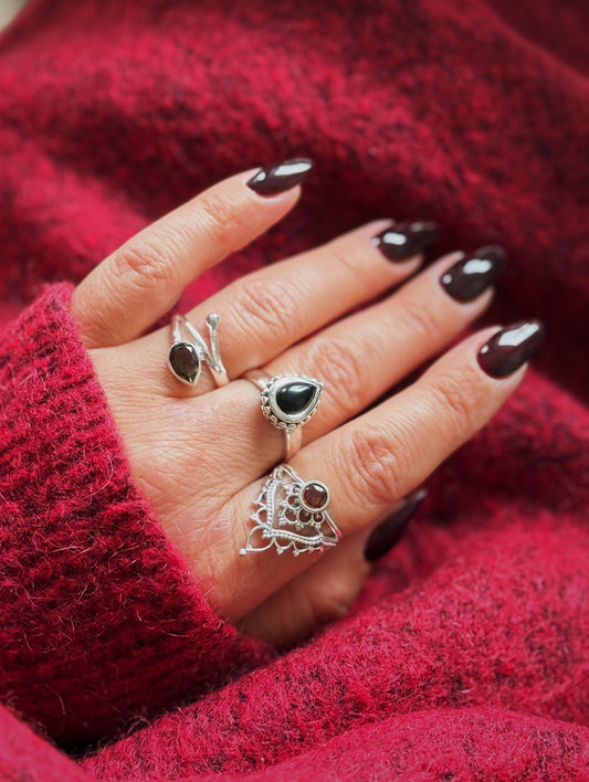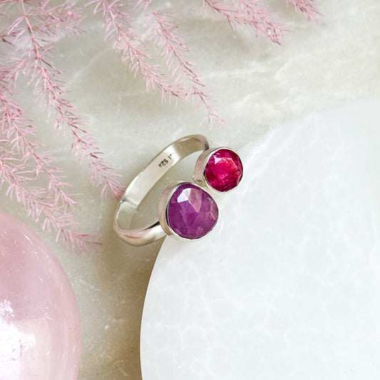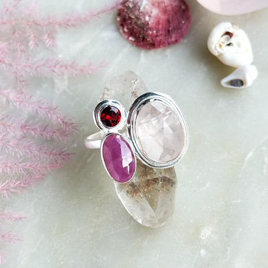 Sidabrinis rožinio kvarco, safyro ir granato žiedas