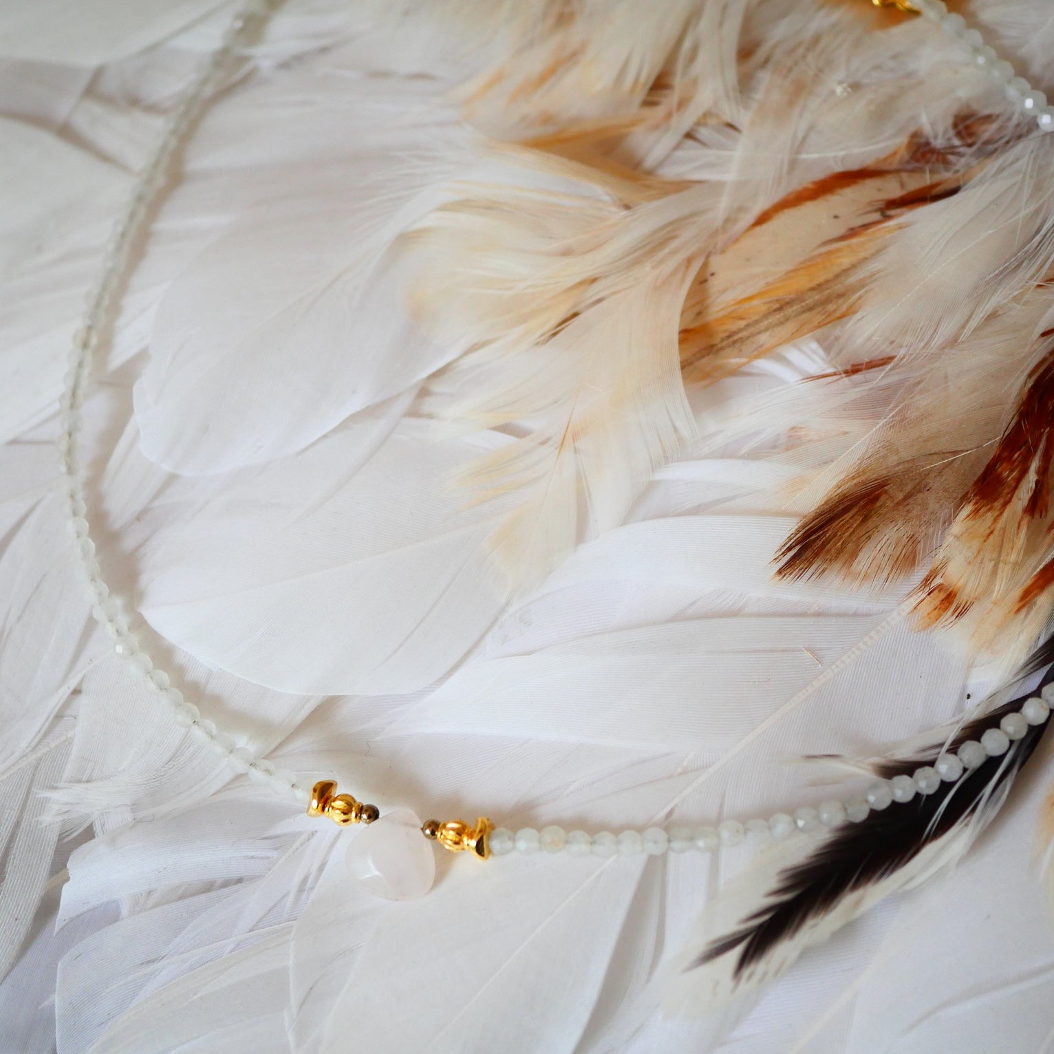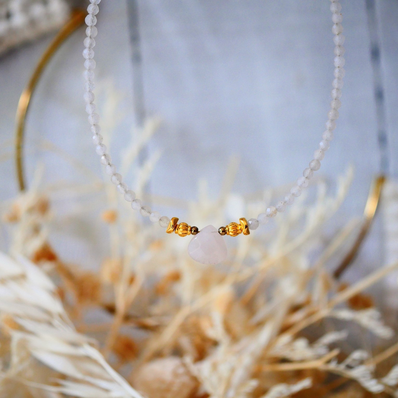 Subtilus mėnulio akmens kaklo vėrinys su Rožinio kvarco pakabuku.