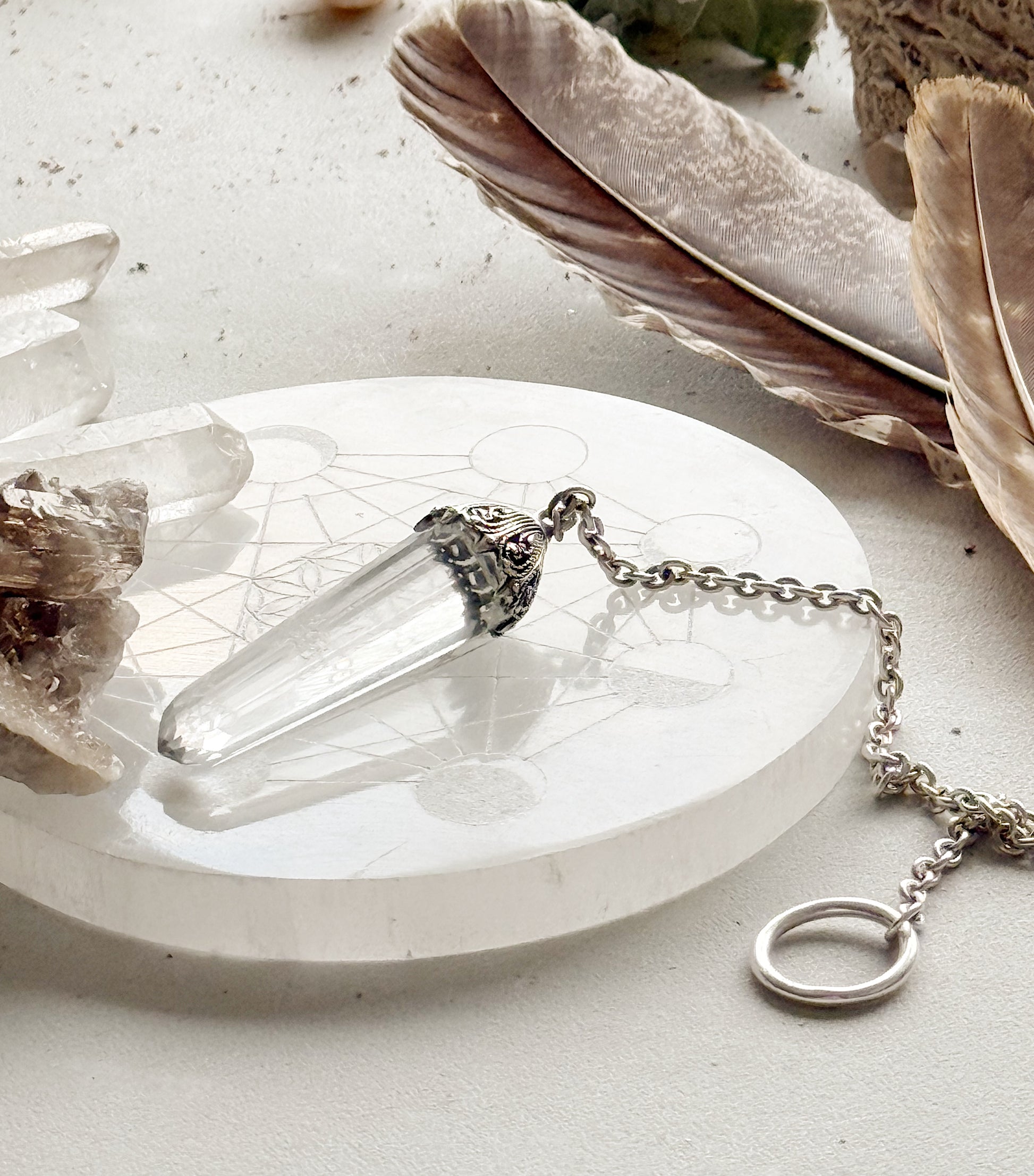 Išskirtinė sidabrinė, daugiabriaunio kalnų krištolo švytuoklė.