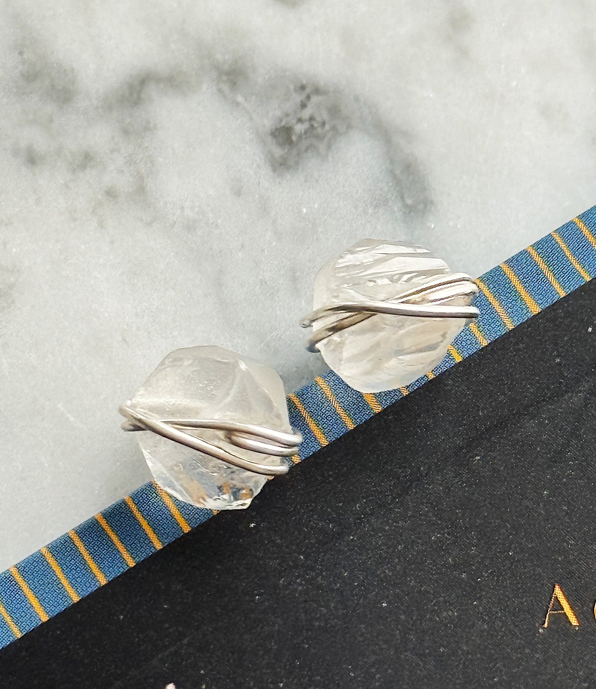 Subtilūs sidabriniai auskarai, puošti natūraliais, minimaliai apdirbtais kalnų krištolo kristalais.