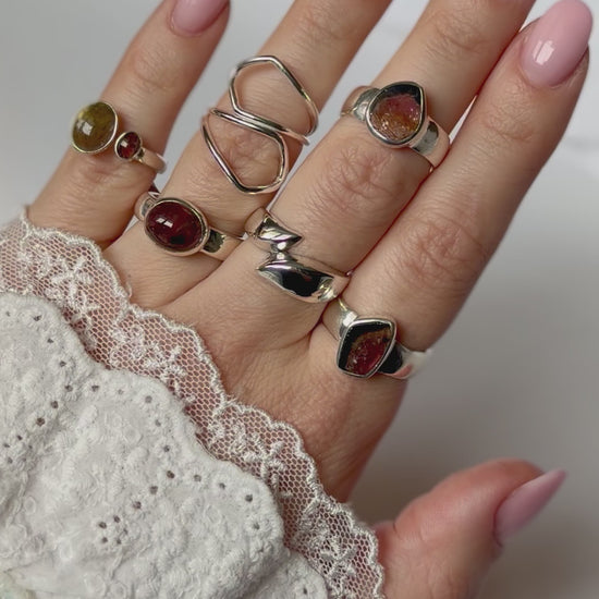 • Vienetinis žiedas puoštas unikaliu arbūzinio turmalino akmenuku. Nešiodama jį galite būti tikra, kad nesutiksite identiško, nes kiekvienas naudojamas kristalas yra išskirtinis.