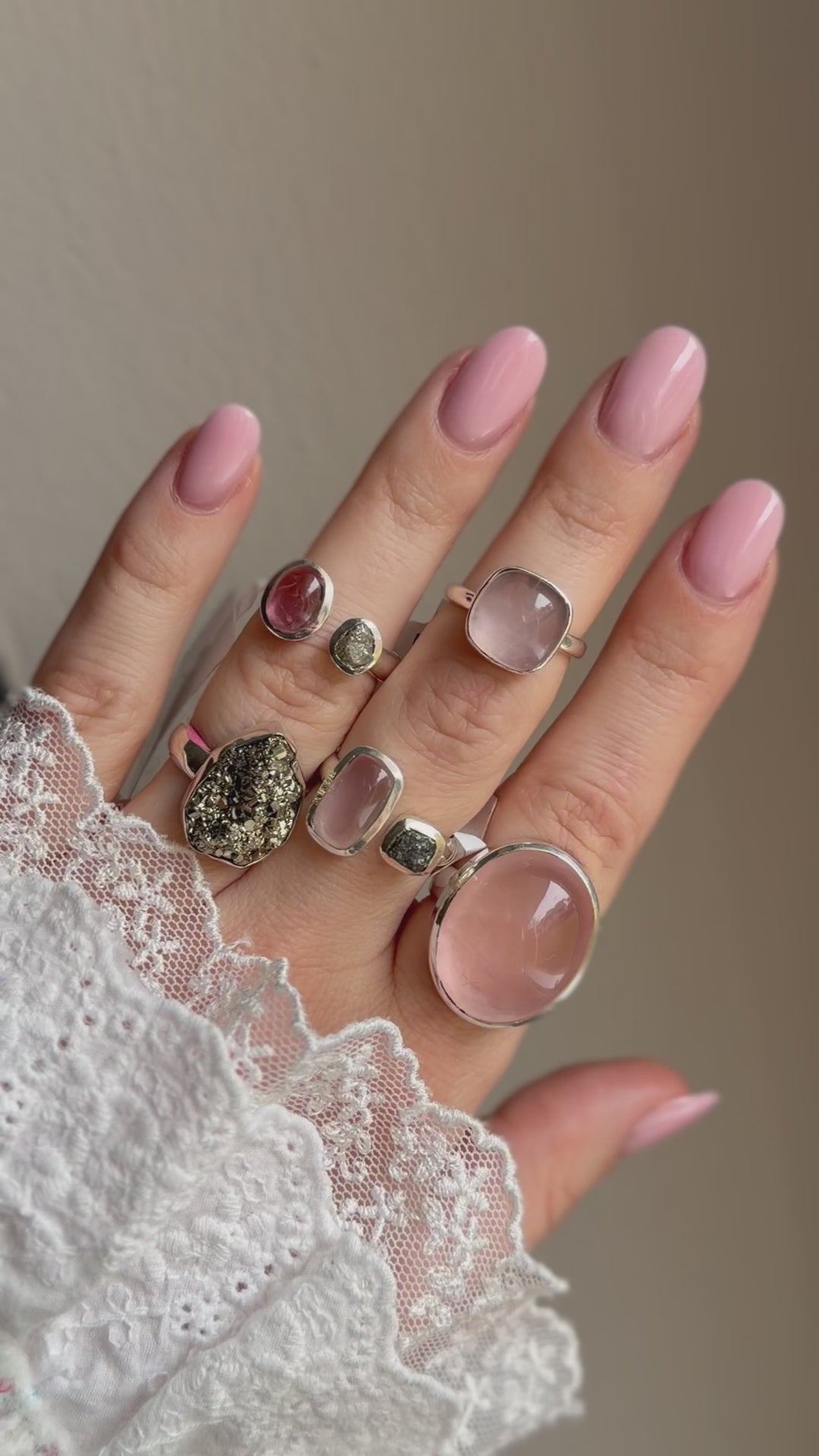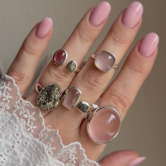 • Žiedas puoštas rožinio kvarco kristalu
