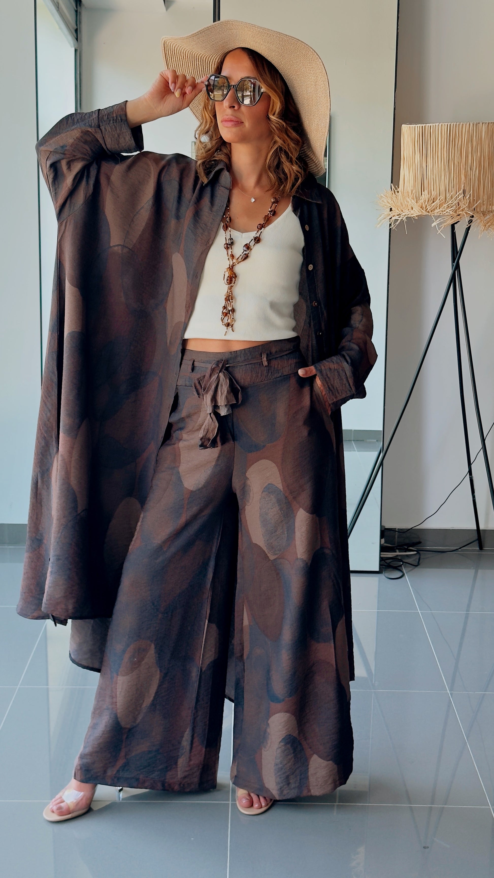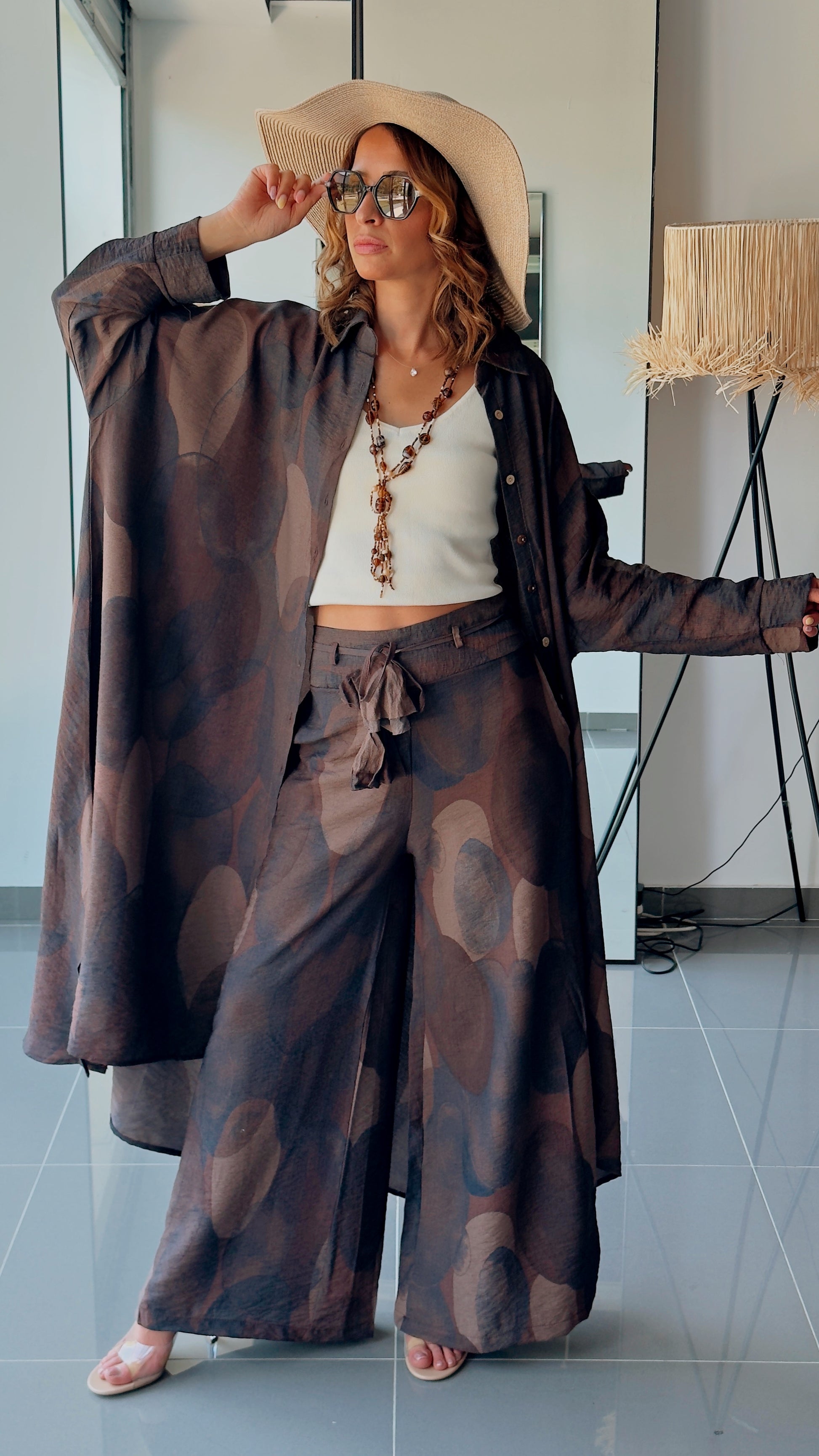 Lengvas, laisvai krentantis dviejų dalių kostiumas, sukurtas moteriai, kuri mėgsta judėti savo ritmu. Platus siluetas ir natūralūs žemės tonai primena šiltą dykumos vėją ir saulėje įkaitusį smėlį.