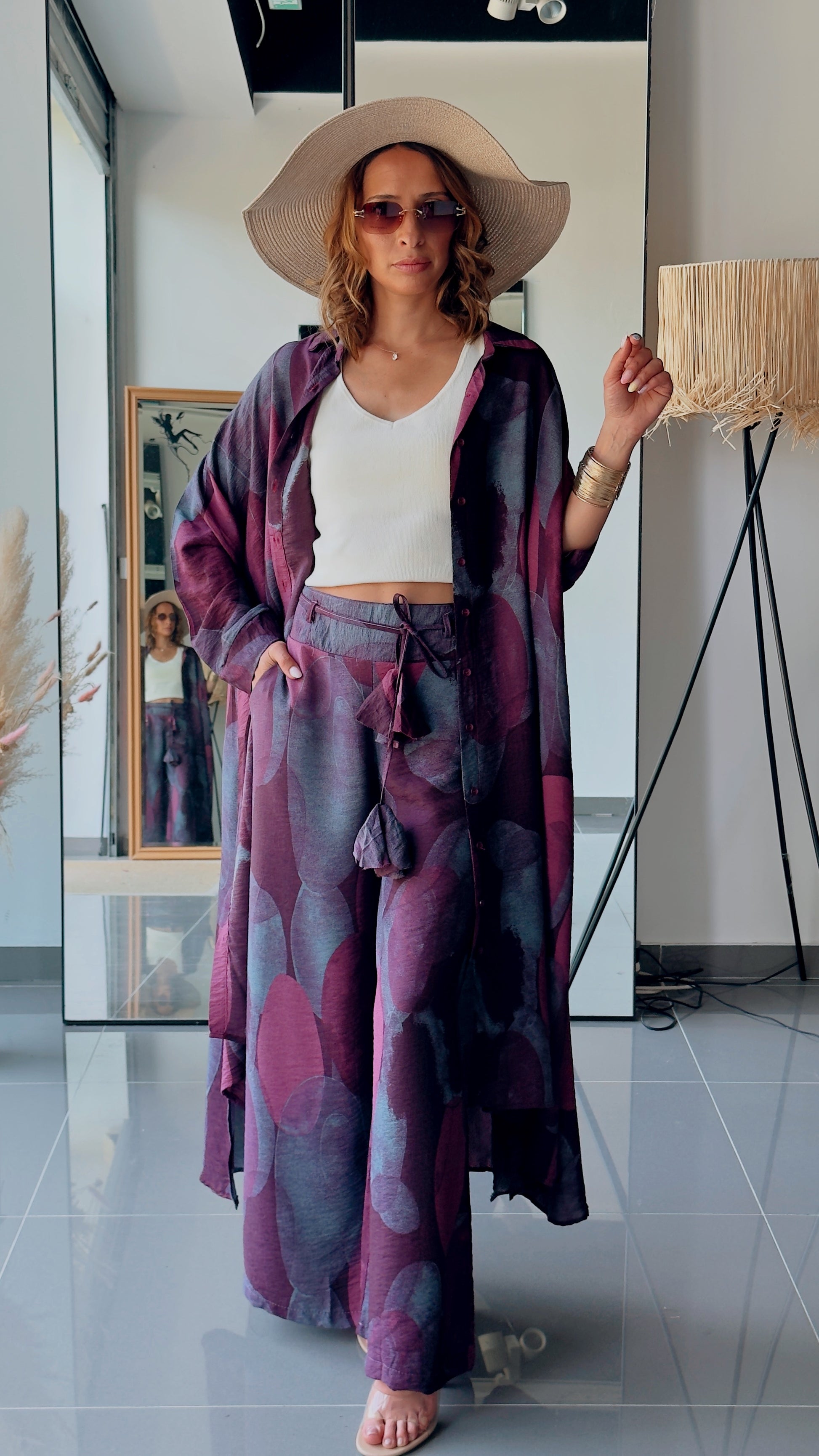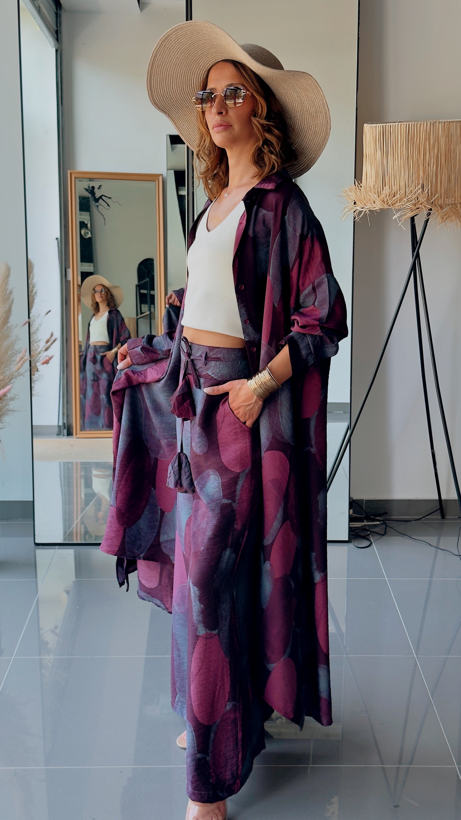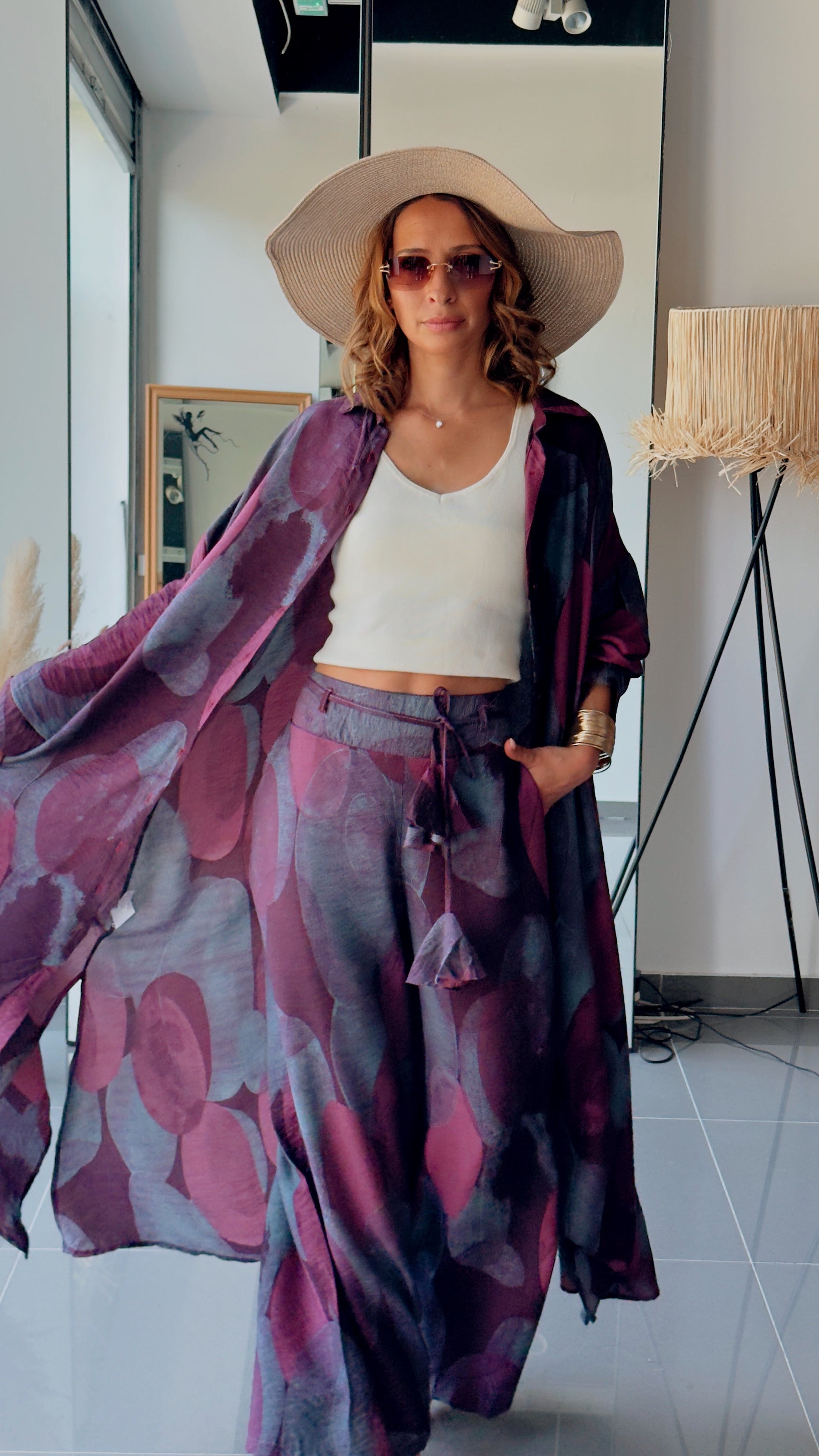 Lengvas, elegantiškai krentantis dviejų dalių kostiumas, kuriame susilieja komfortas ir bohemiška elegancija. Gilūs slyvų ir tamsių uogų atspalviai suteikia paslaptingumo, o laisvas siluetas leidžia judėti lengvai ir natūraliai.