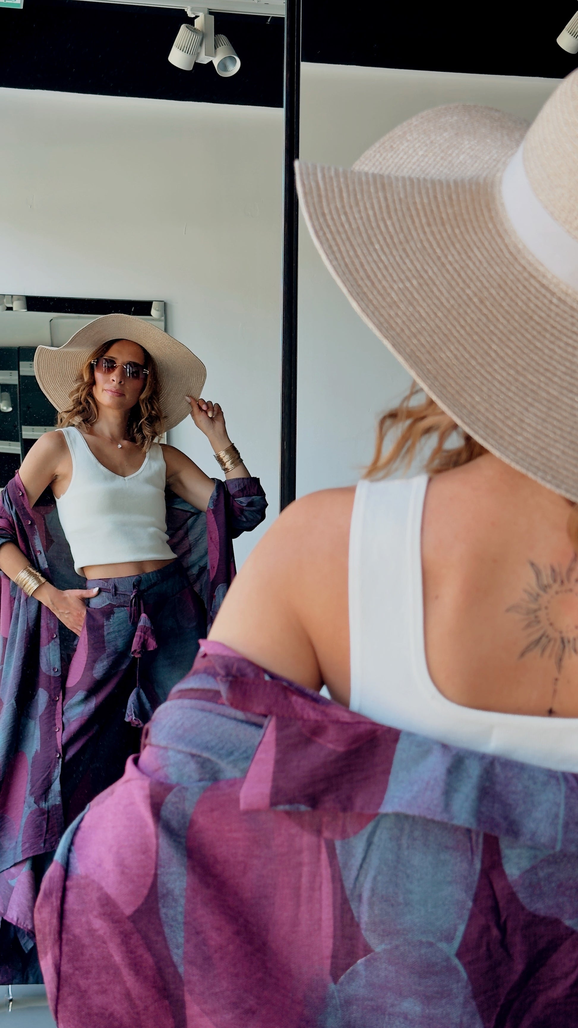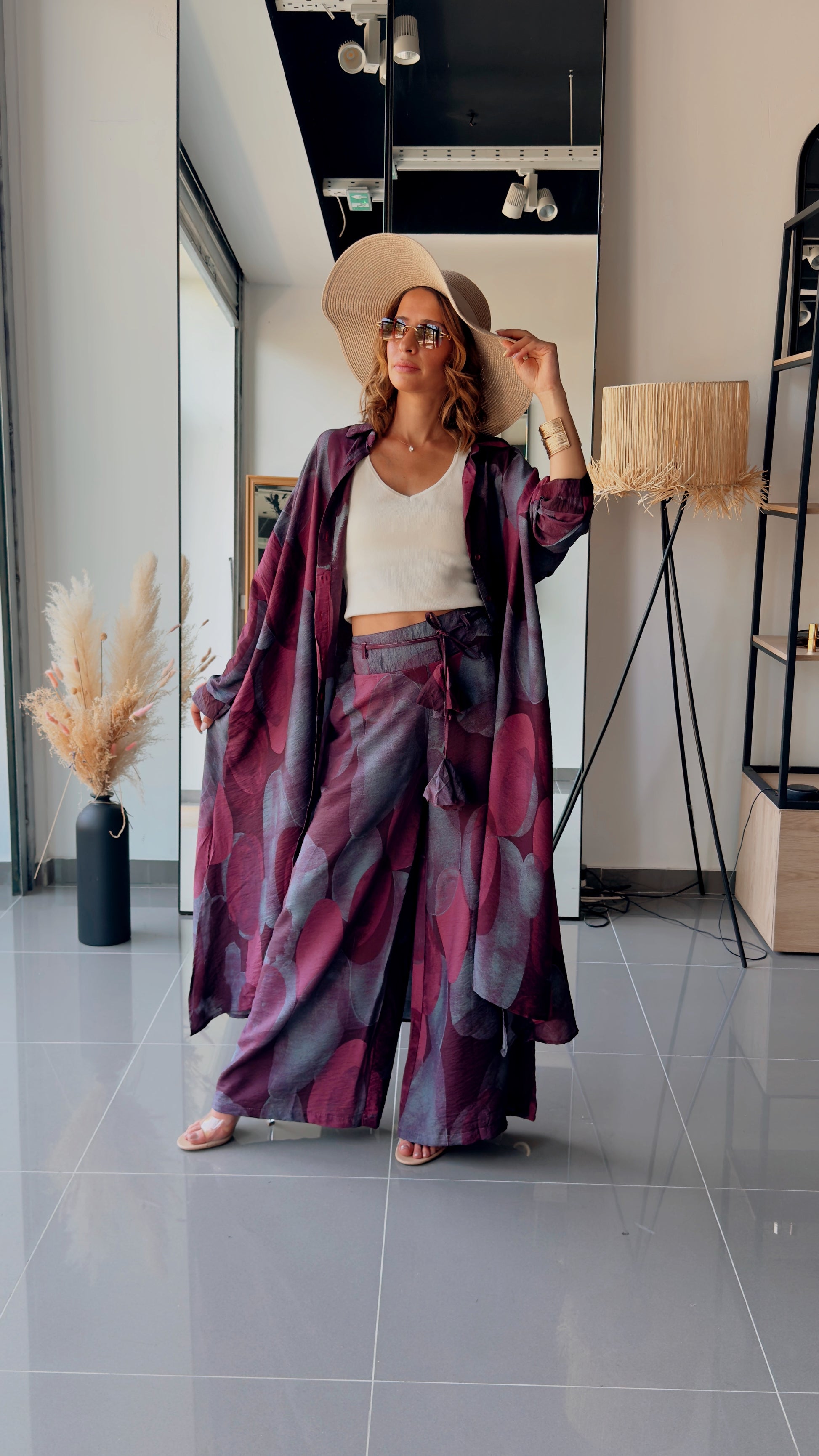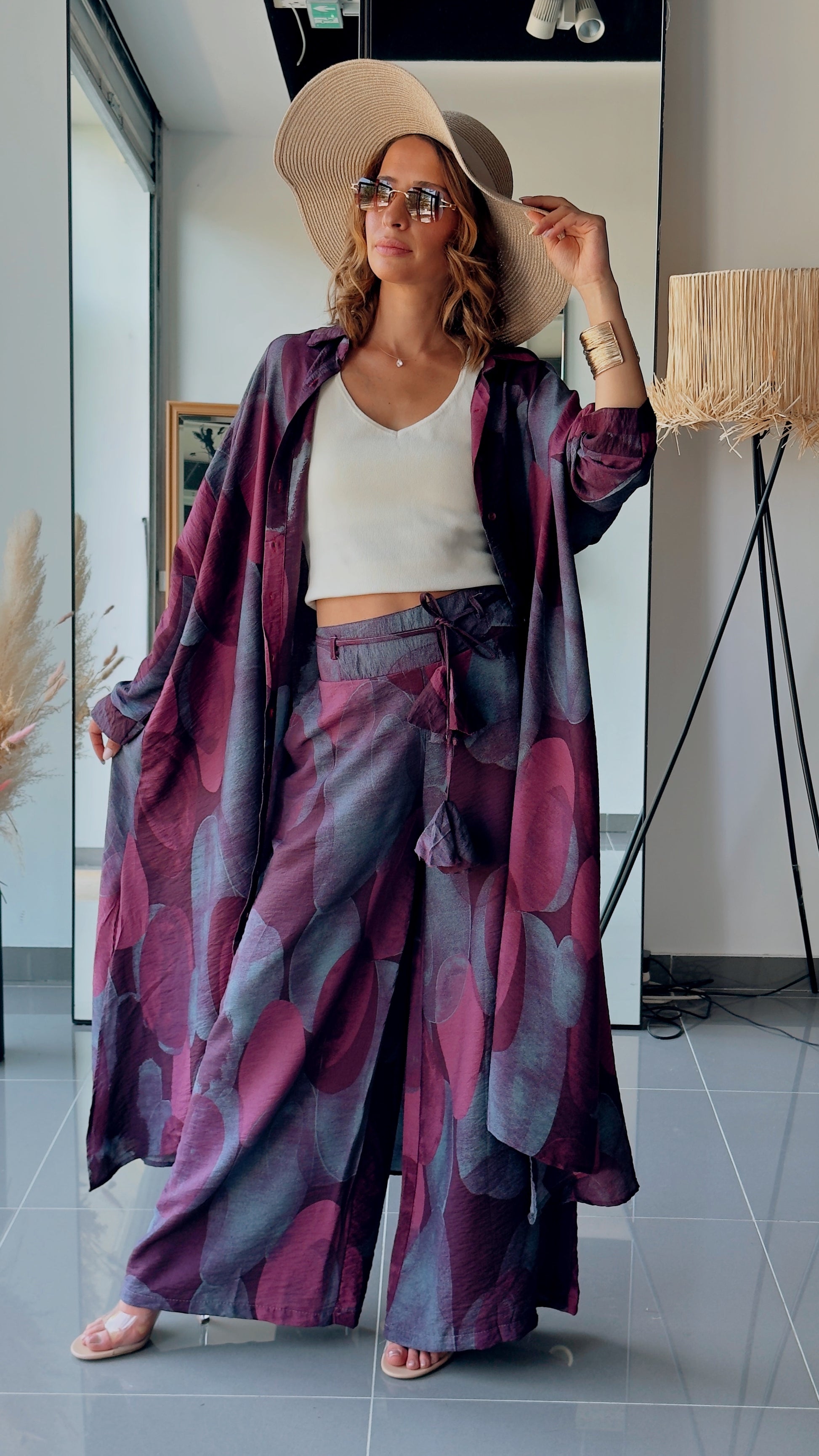 Lengvas, elegantiškai krentantis dviejų dalių kostiumas, kuriame susilieja komfortas ir bohemiška elegancija. Gilūs slyvų ir tamsių uogų atspalviai suteikia paslaptingumo, o laisvas siluetas leidžia judėti lengvai ir natūraliai.