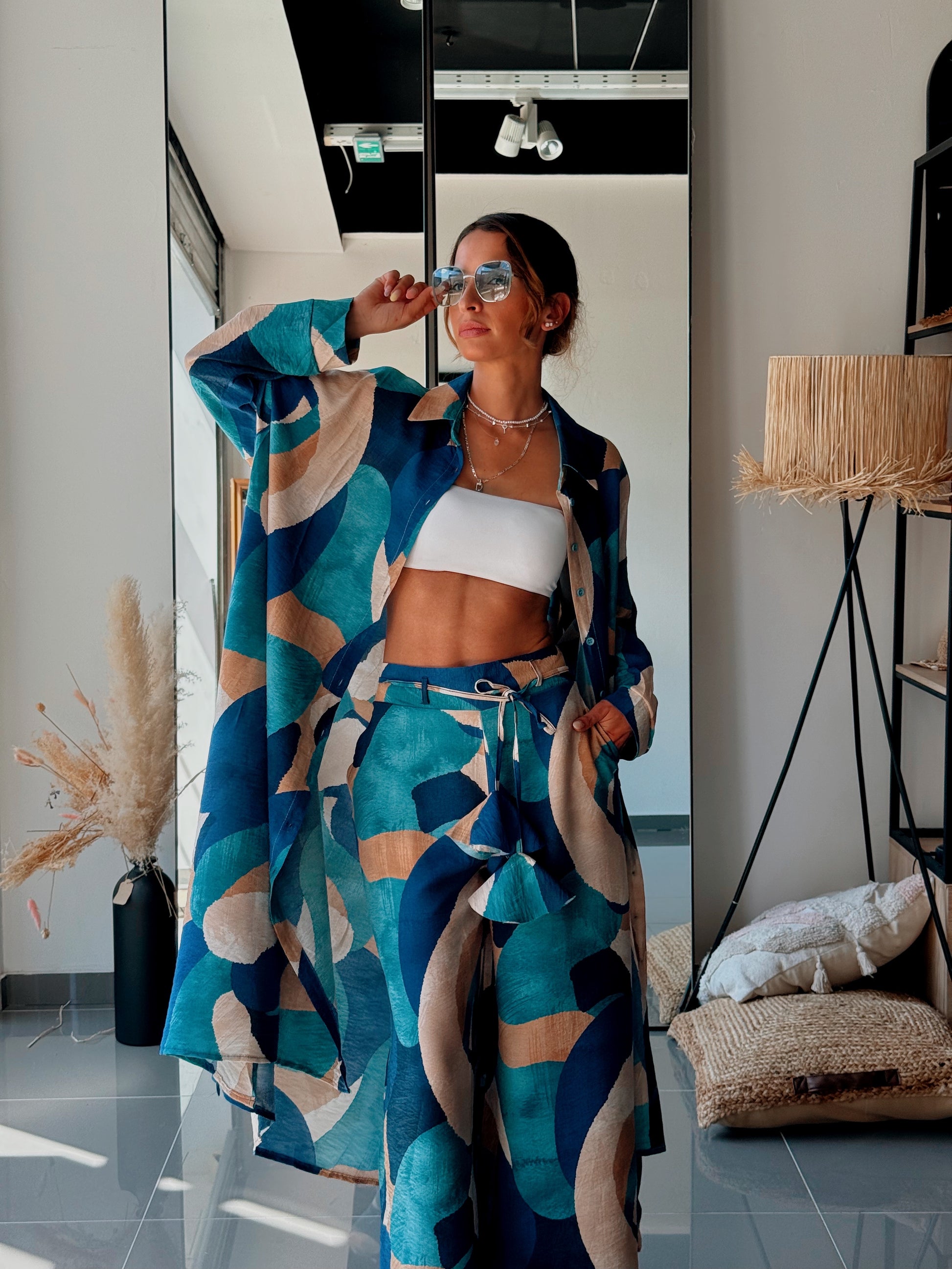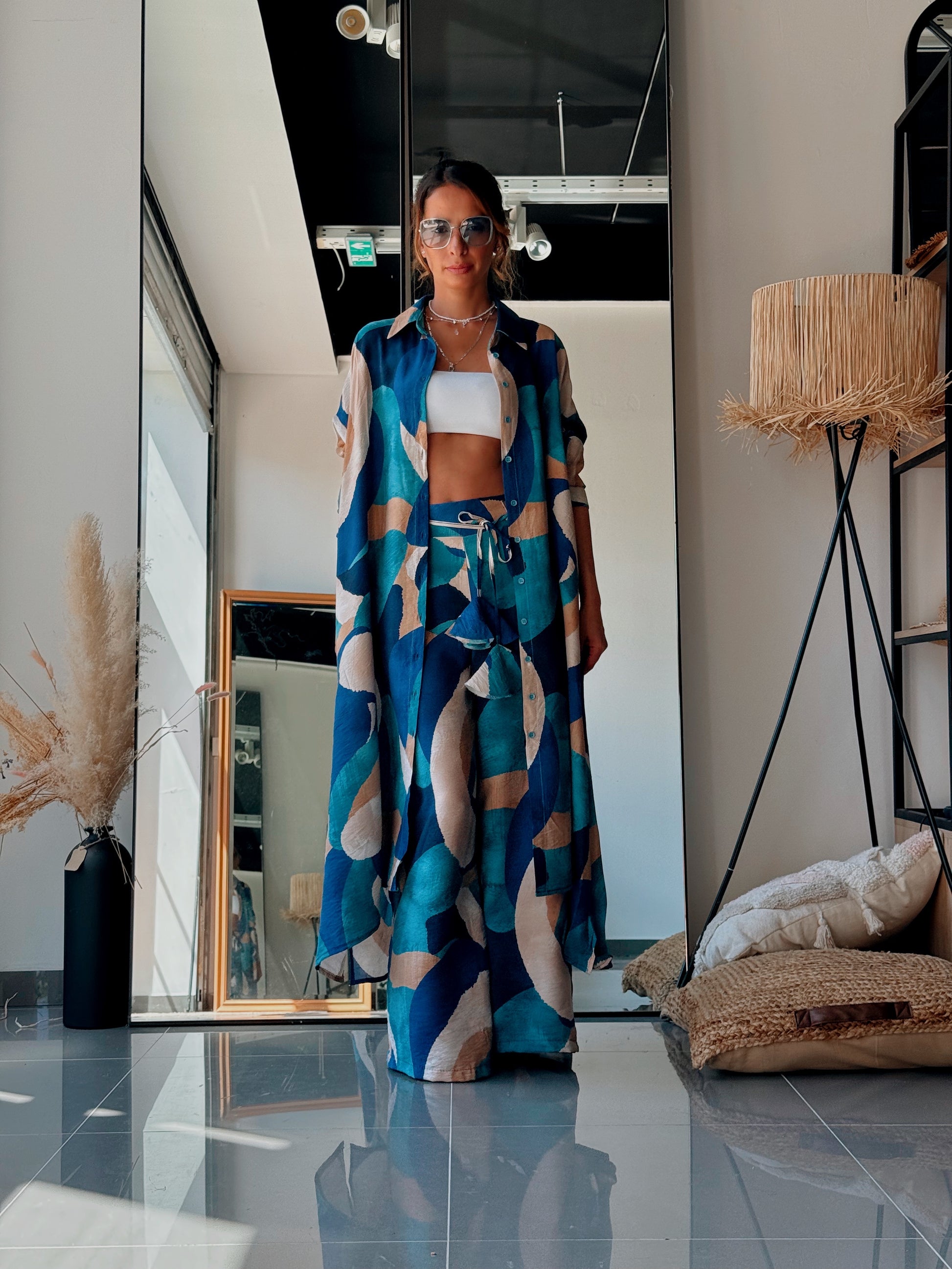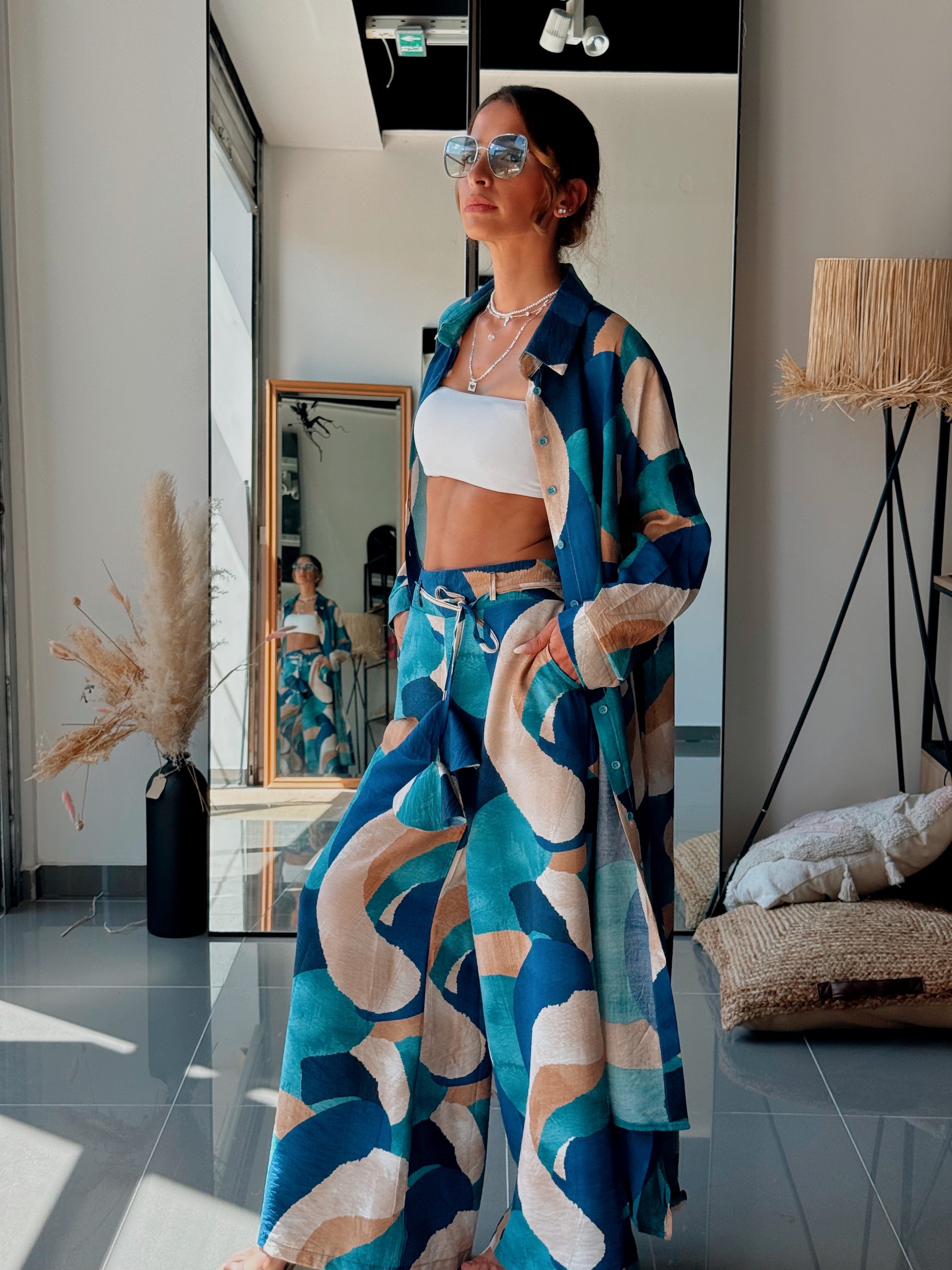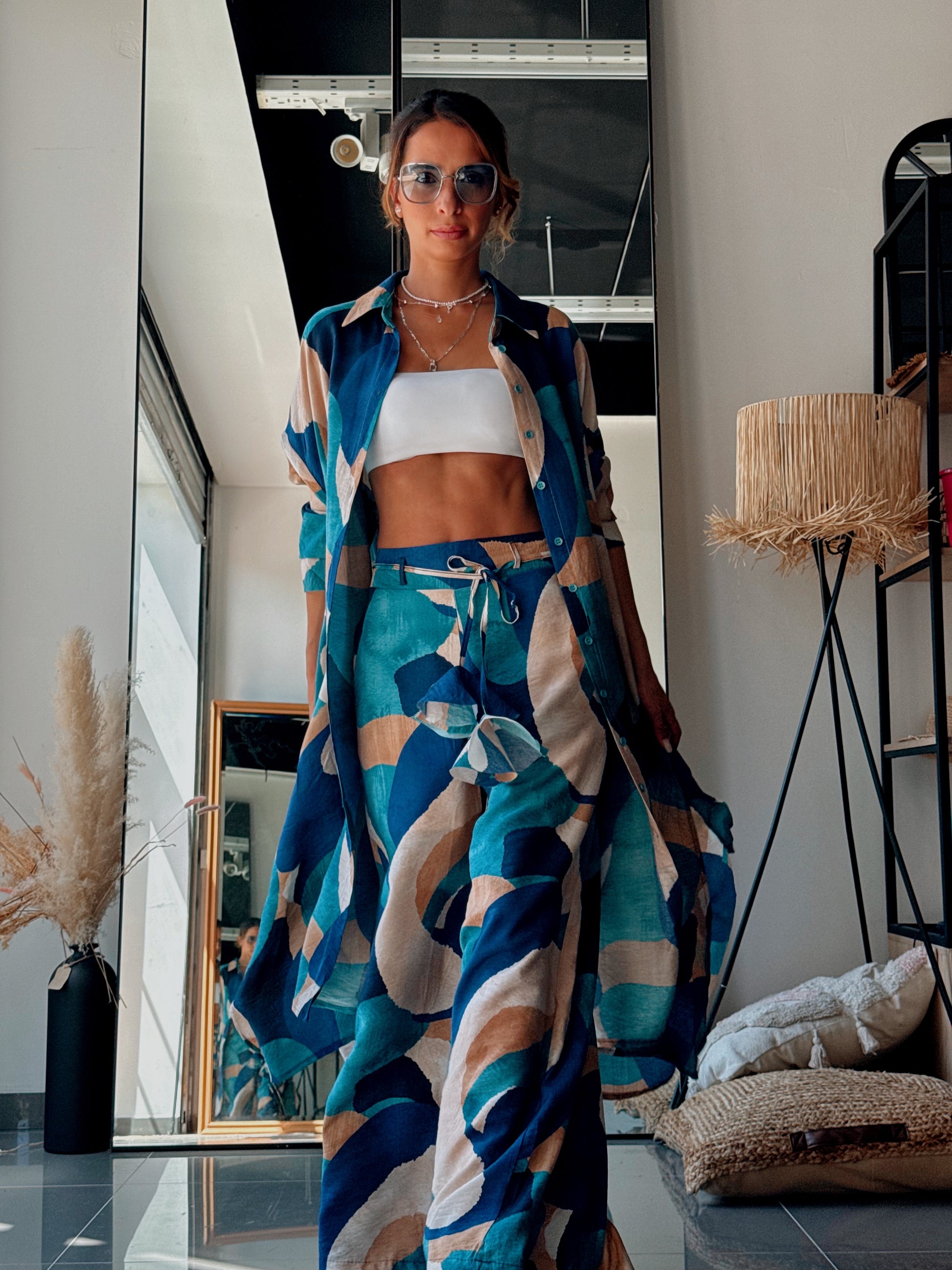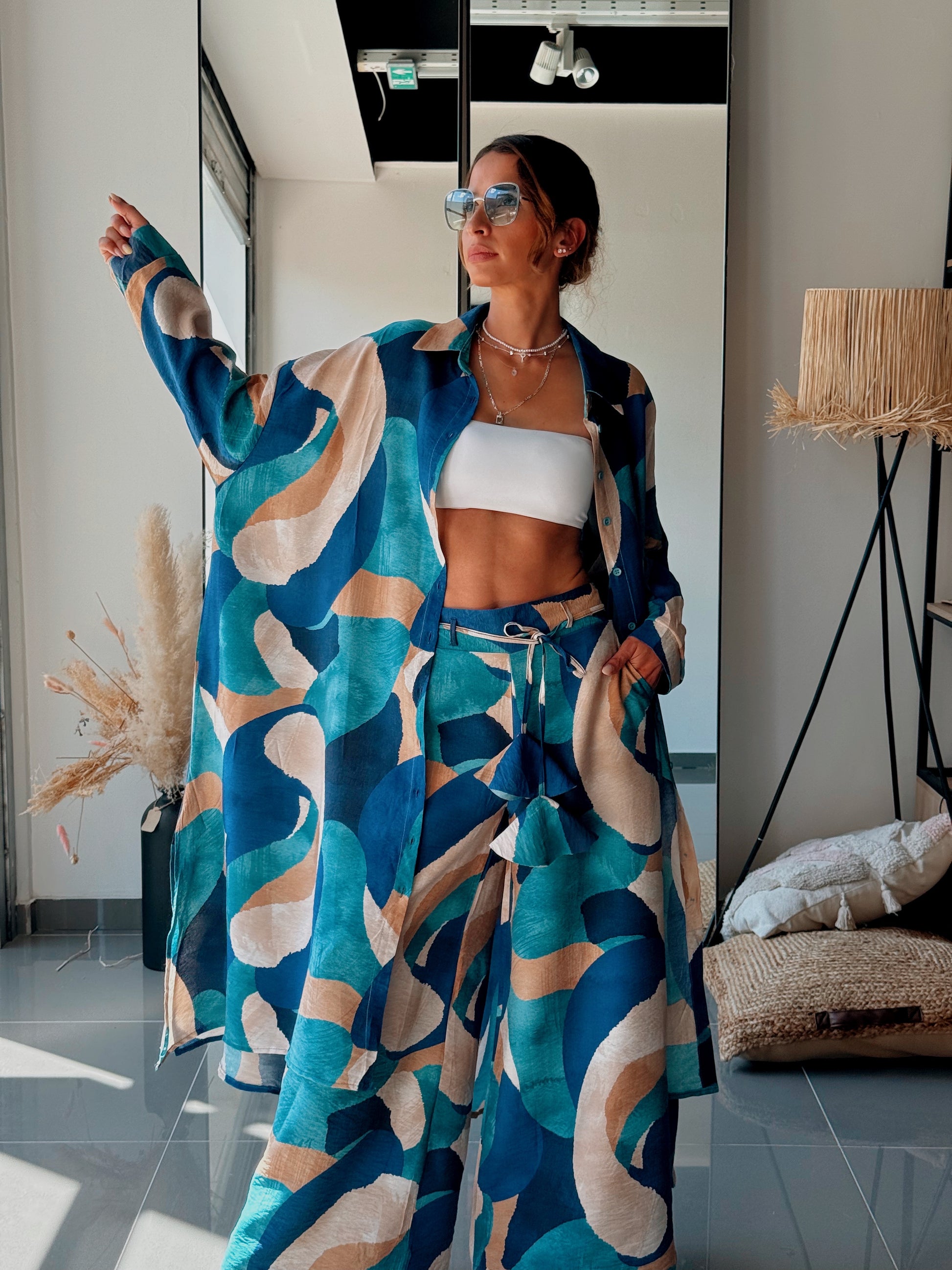 Lengvas, laisvai krentantis dviejų dalių kostiumas, įkvėptas jūros spalvų ir vasaros laisvės. Bangų raštai ir turkio atspalviai primena vandenyno judėjimą, o platus siluetas leidžia jaustis lengvai ir natūraliai.