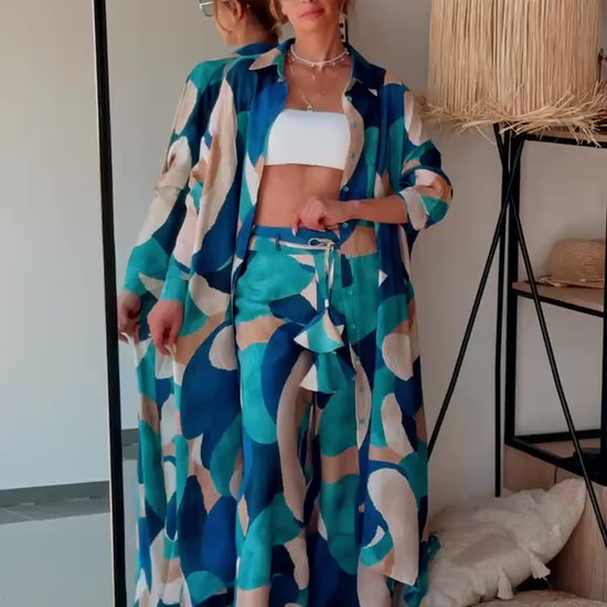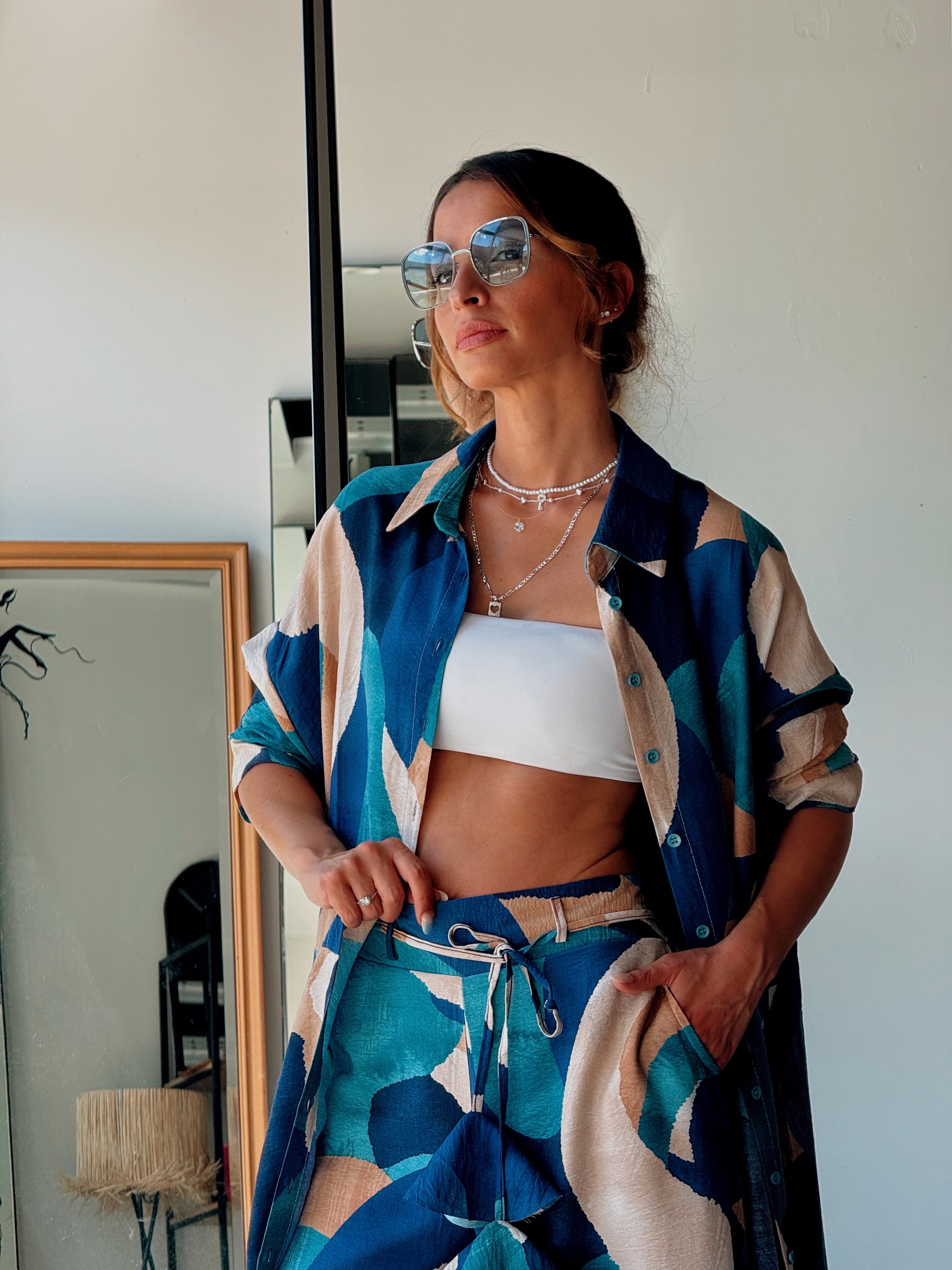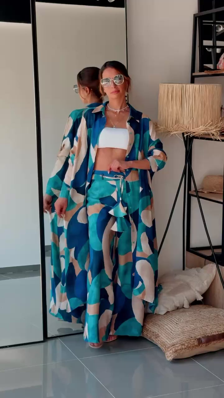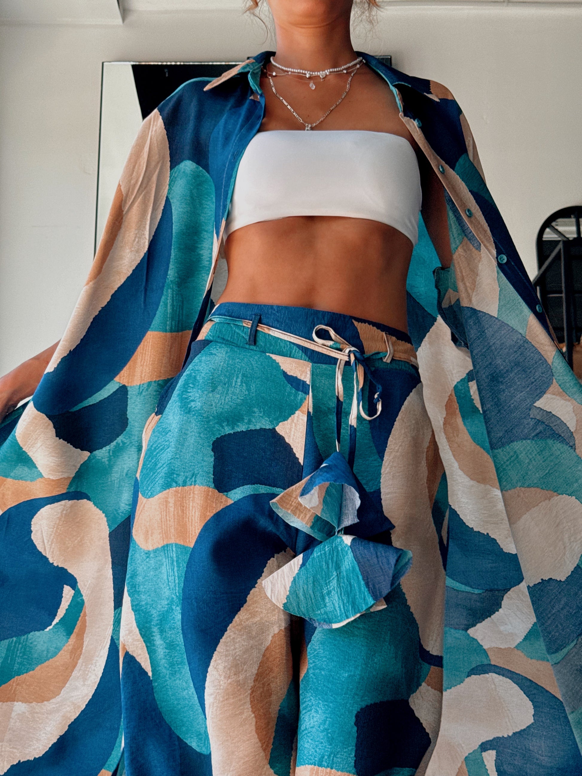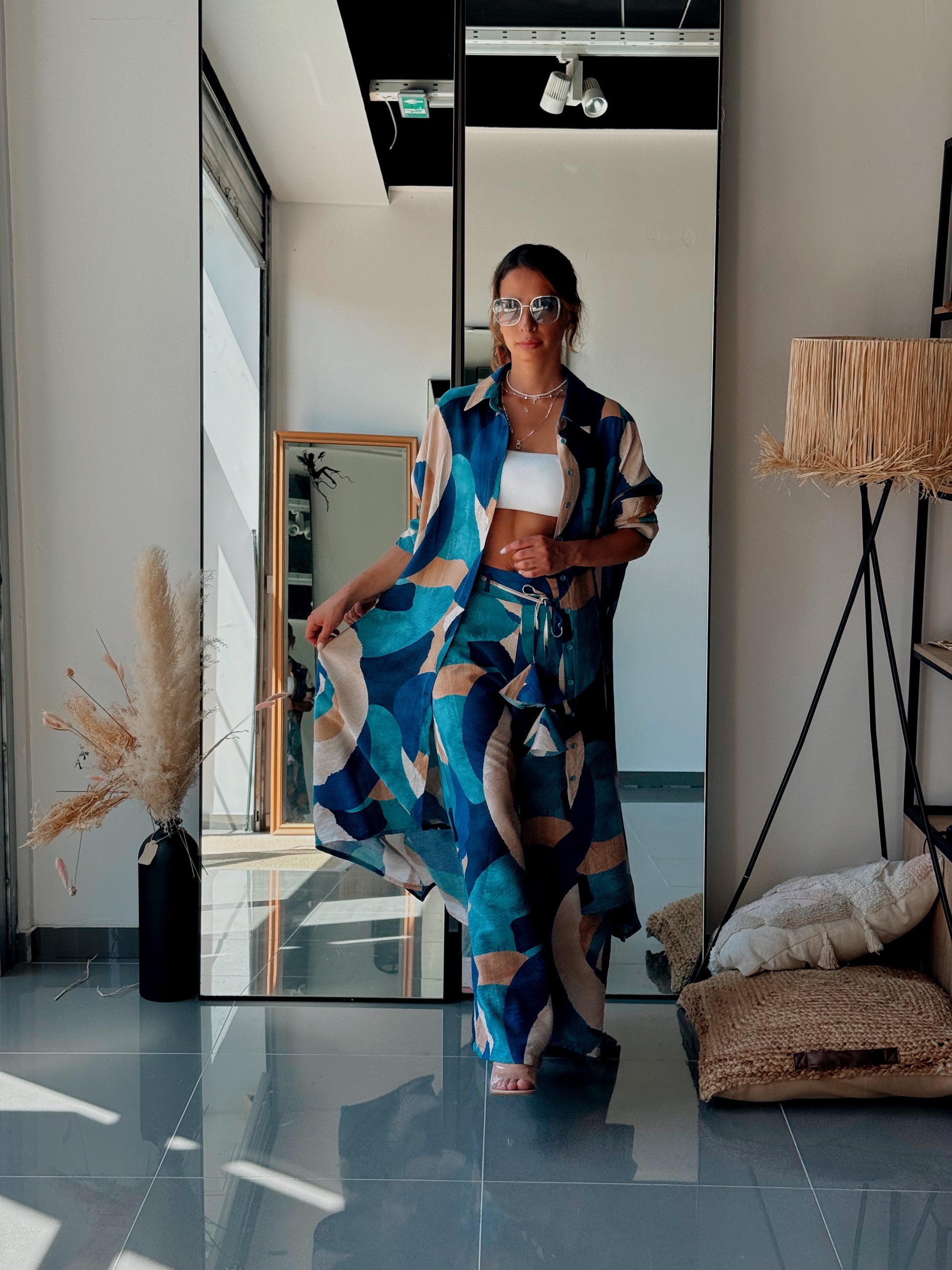 Lengvas, laisvai krentantis dviejų dalių kostiumas, įkvėptas jūros spalvų ir vasaros laisvės. Bangų raštai ir turkio atspalviai primena vandenyno judėjimą, o platus siluetas leidžia jaustis lengvai ir natūraliai.