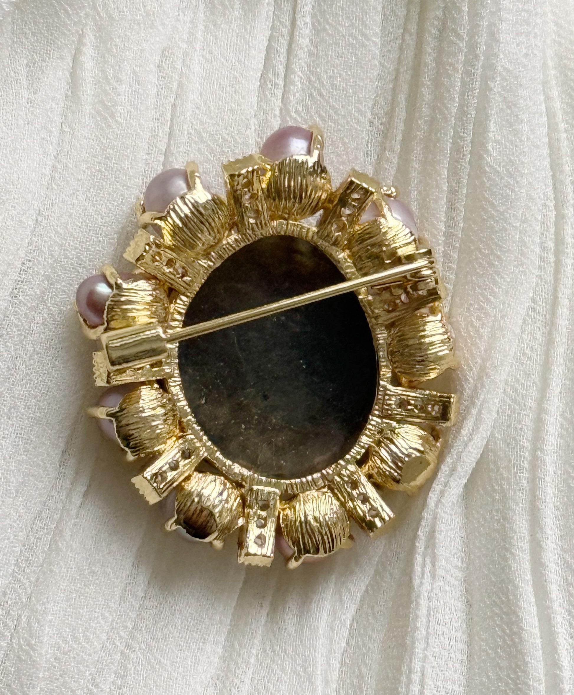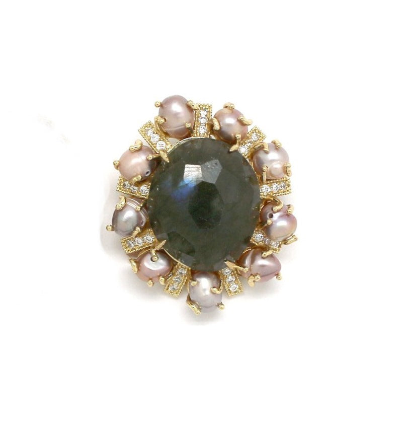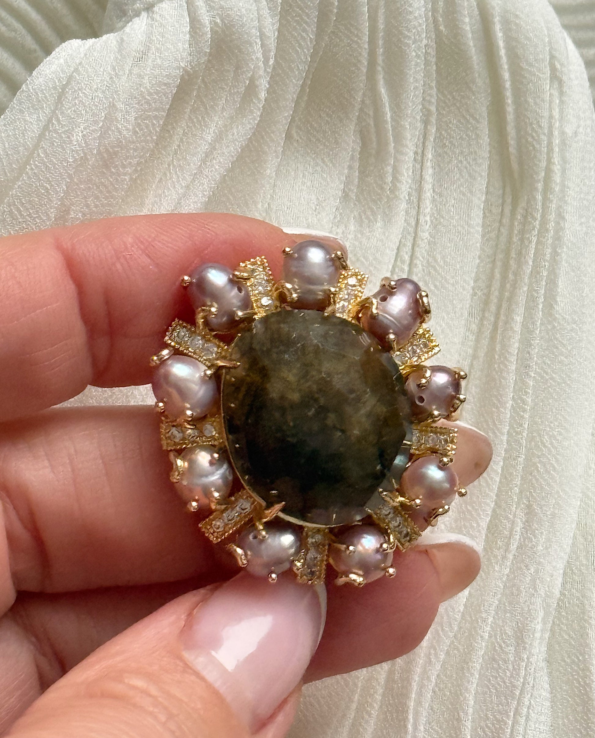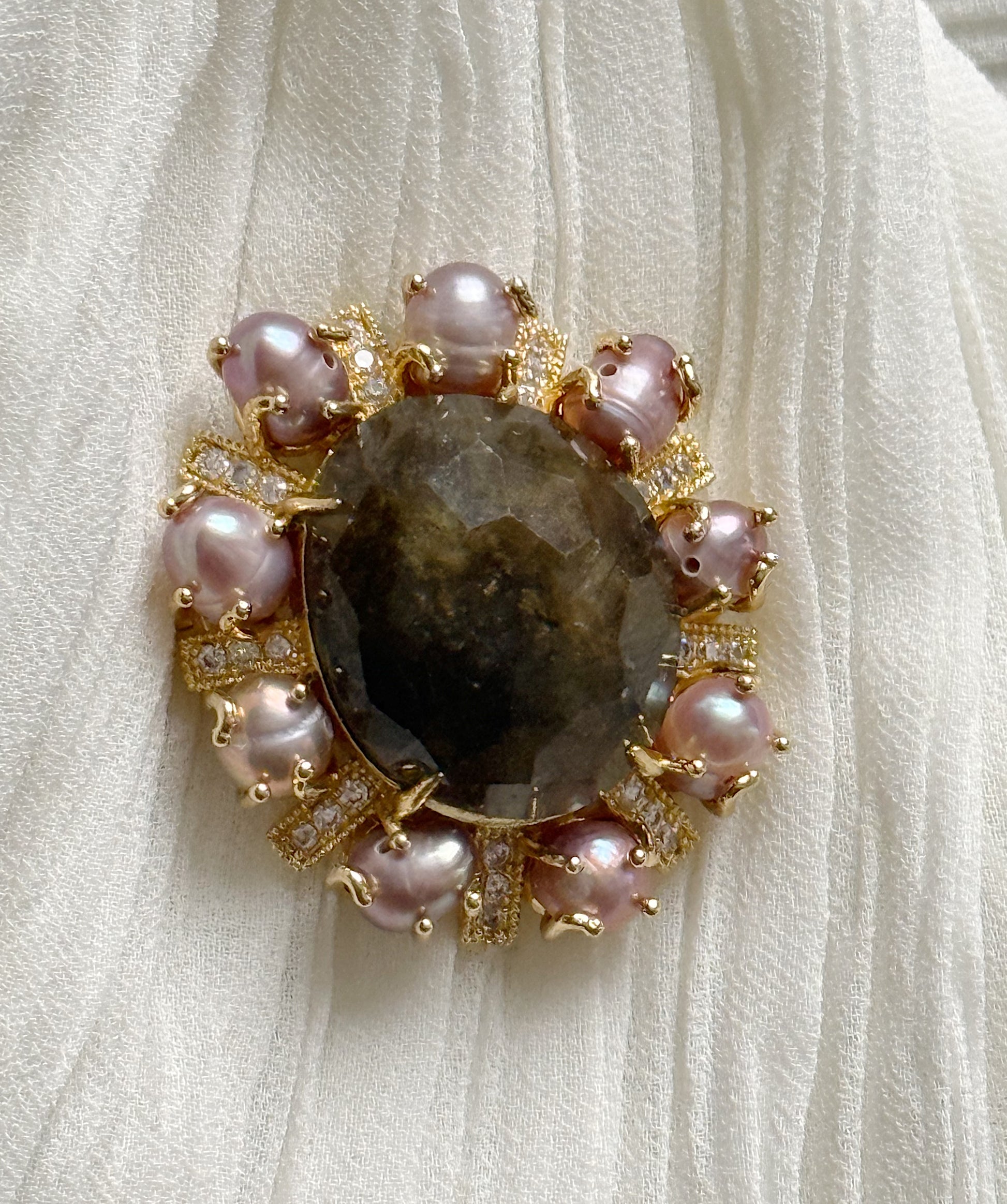 A unique brooch with carnelian and labradorite crystals, adorned with natural pearls. The synergy of these crystals helps clarify internal thoughts, trust your intuition, and strengthen inner wisdom.