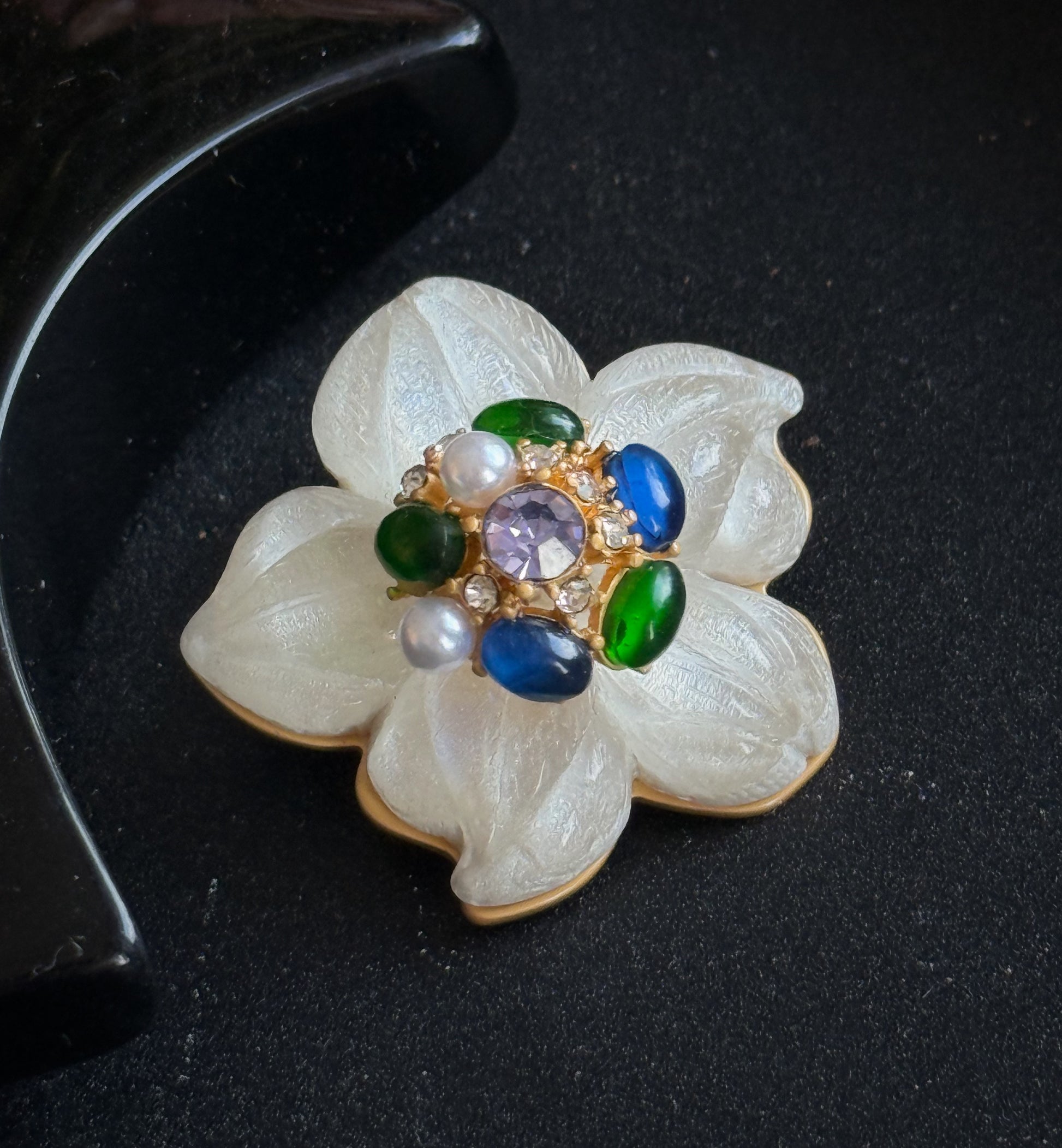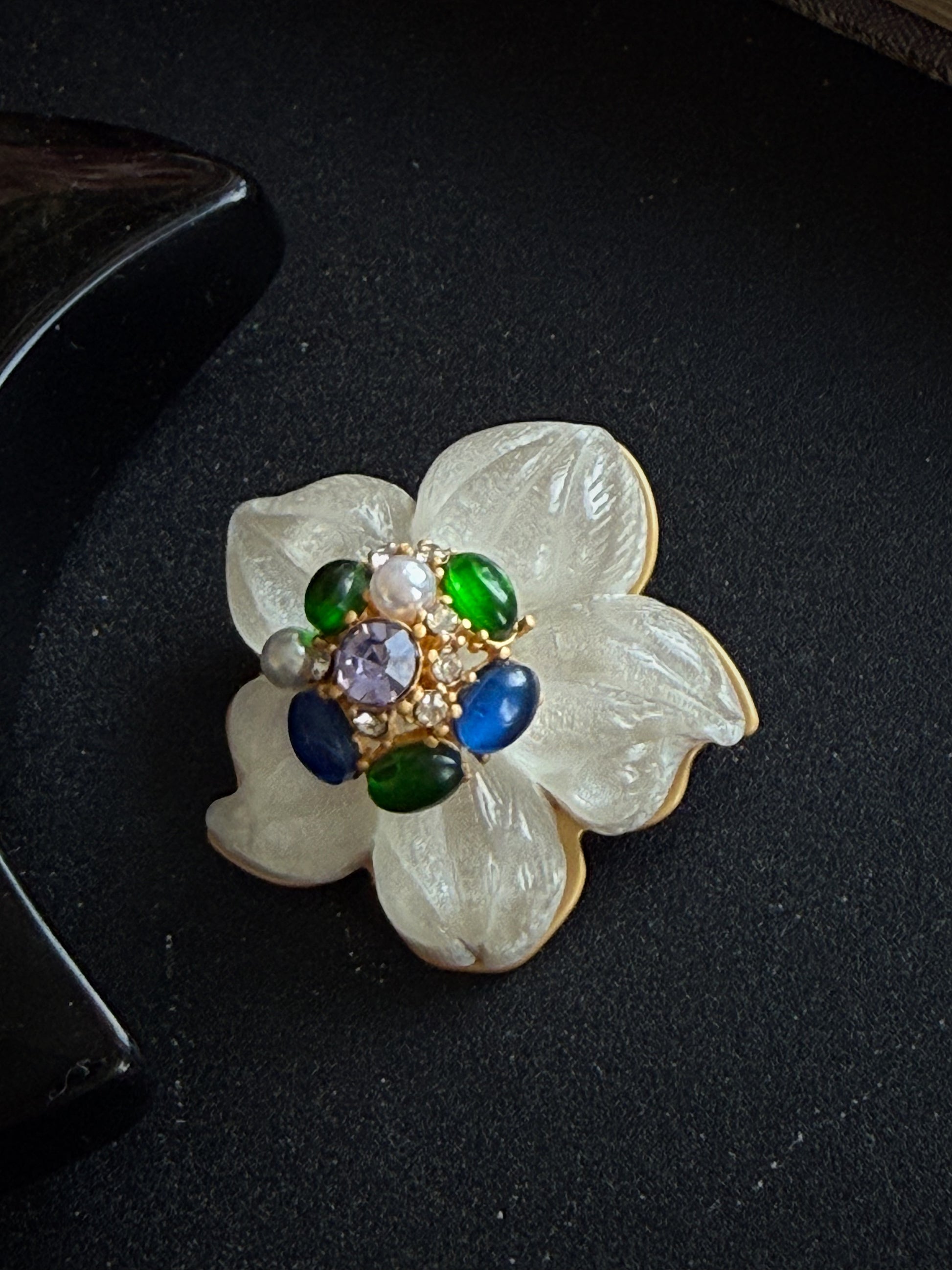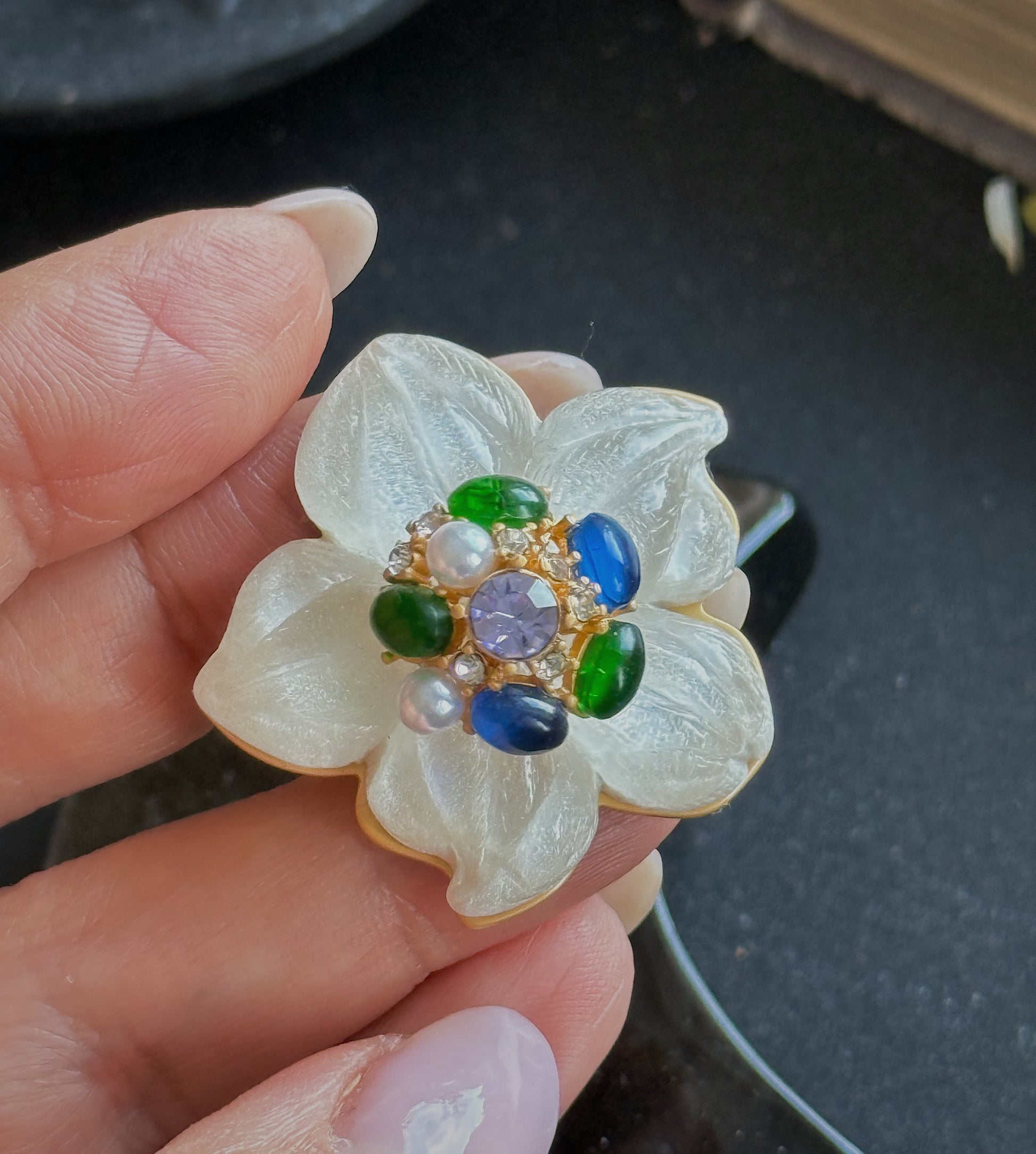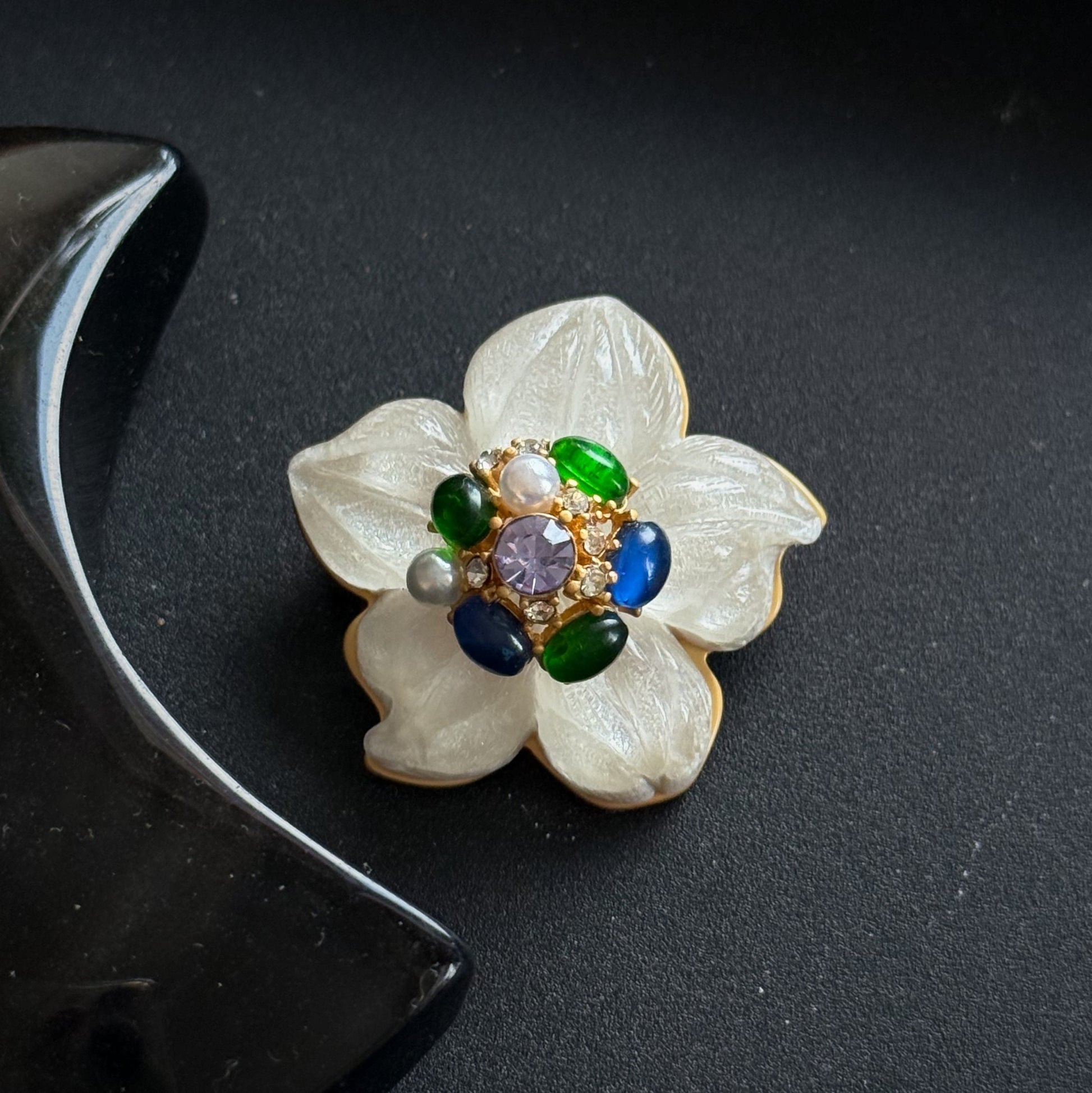 Gėlės centre susijungia spalvoti akmenėliai ir perlai, kurie sukuria gyvybingą, šiek tiek paslaptingą kompoziciją. Mėlyni ir žali akmenėliai primena dangaus ir gamtos spalvas, o šviesūs perlai suteikia papuošalui elegantiškos harmonijos. Centre spindintis akmuo tampa šios mažos gėlės širdimi.