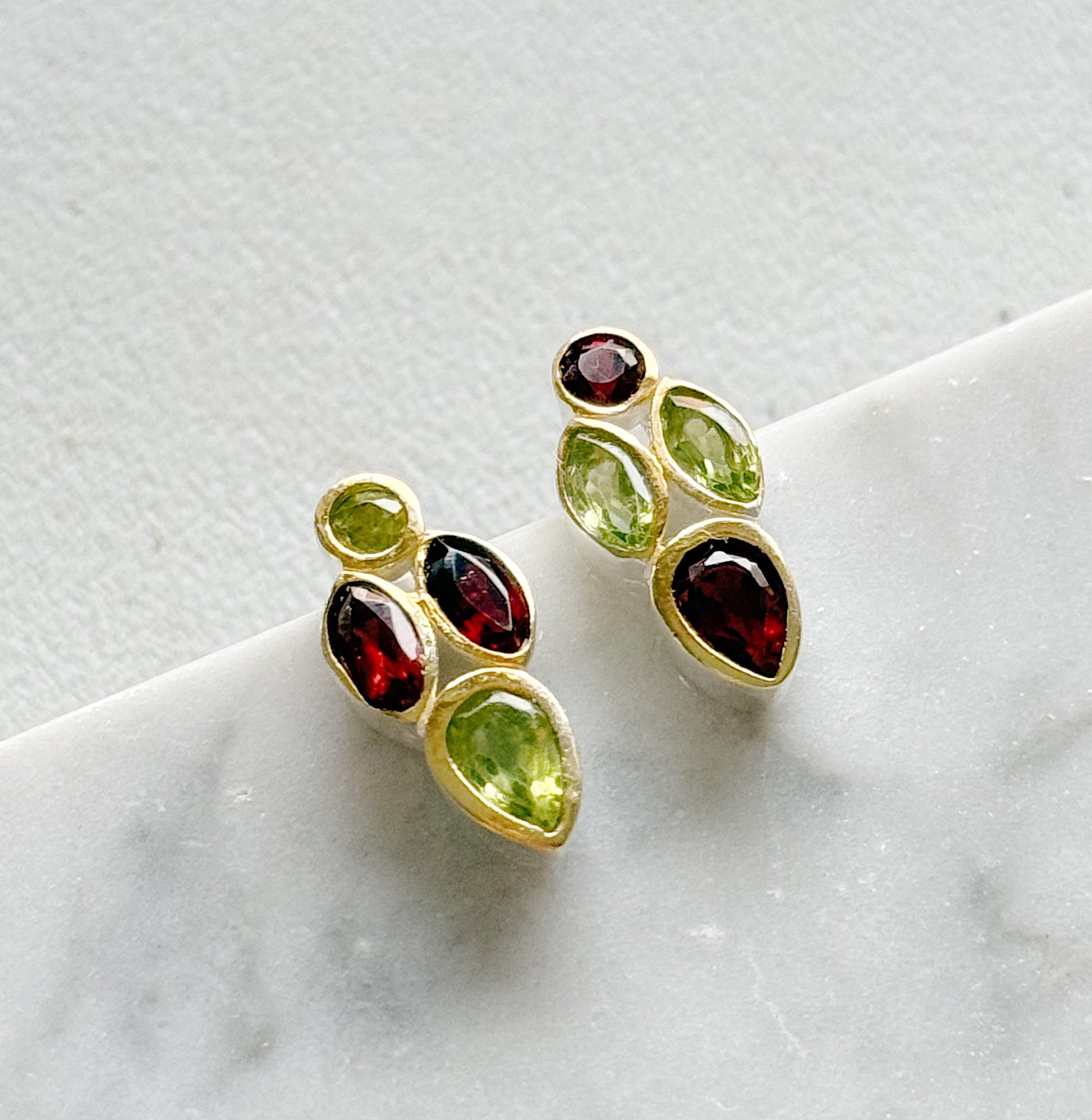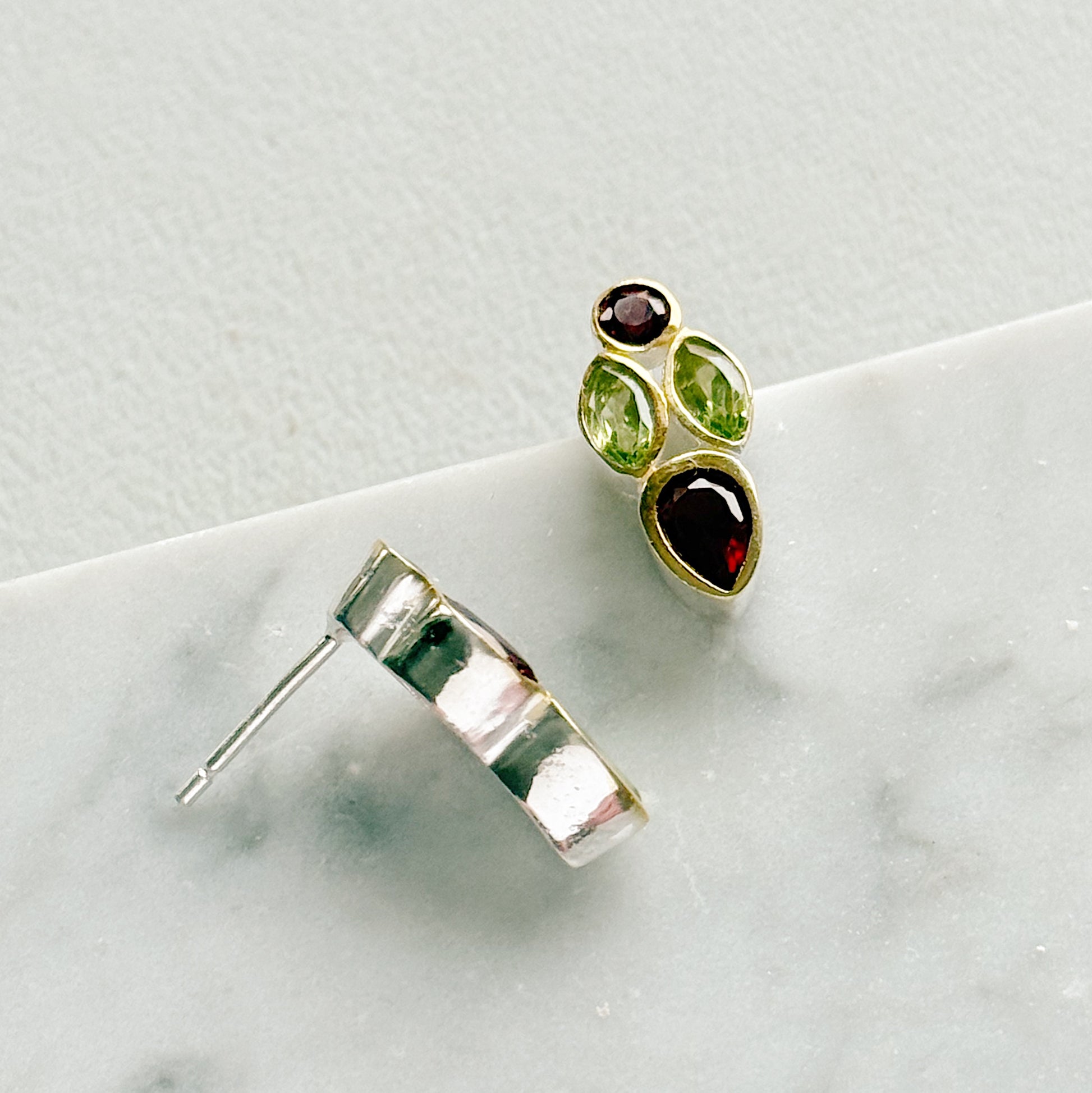 Subtilūs sidabriniai auskarai, puošti peridoto ir granato kristalais.