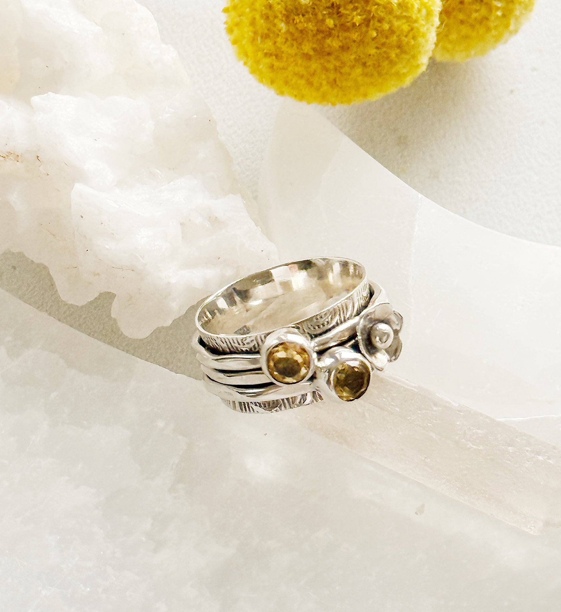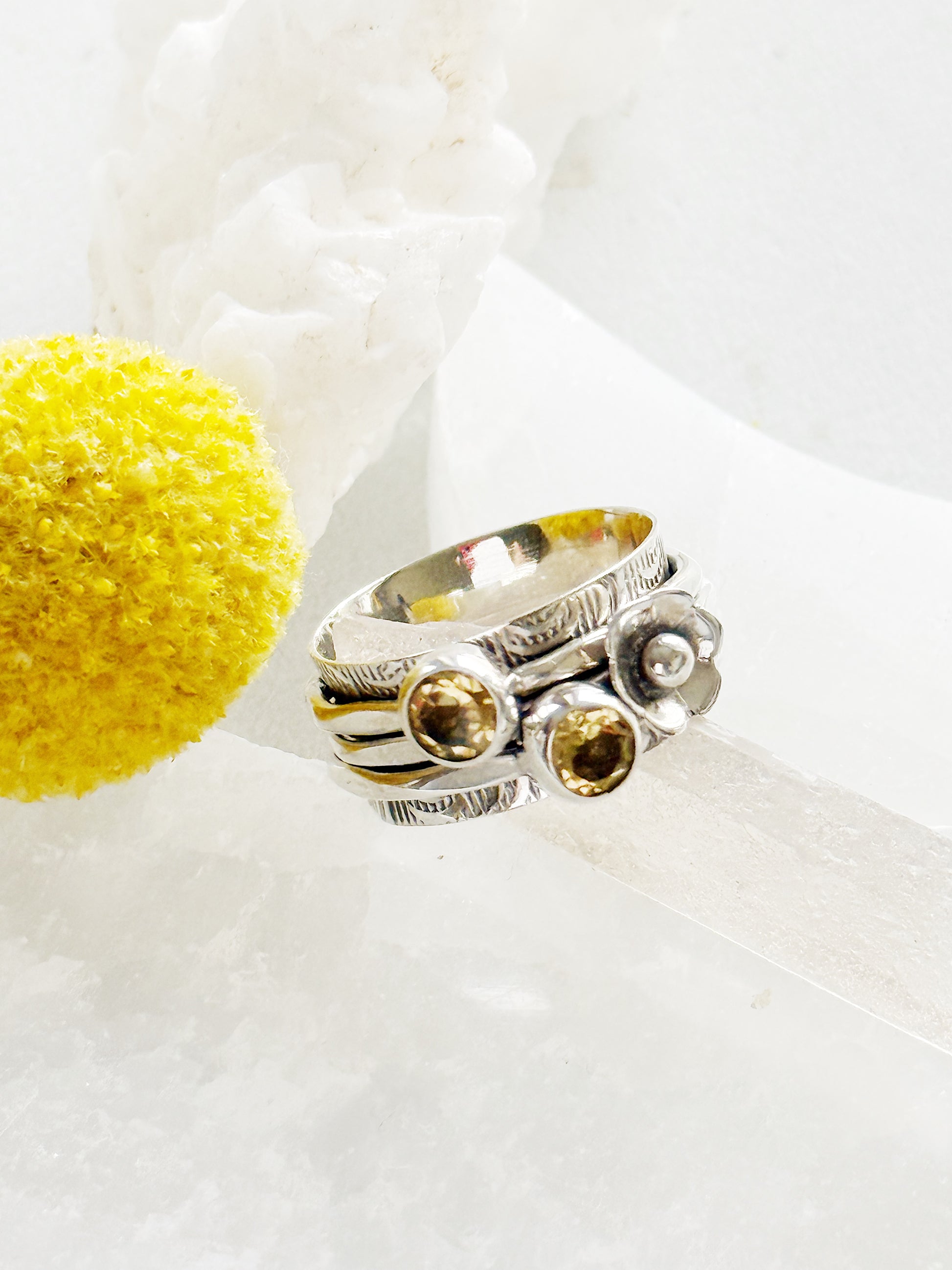 Žavingas ir unikalus žiedelis, puoštas dviem citrino kristalais ir gėlės žiedu, kuriuos galima sukti aplink žiedo pagrindą.