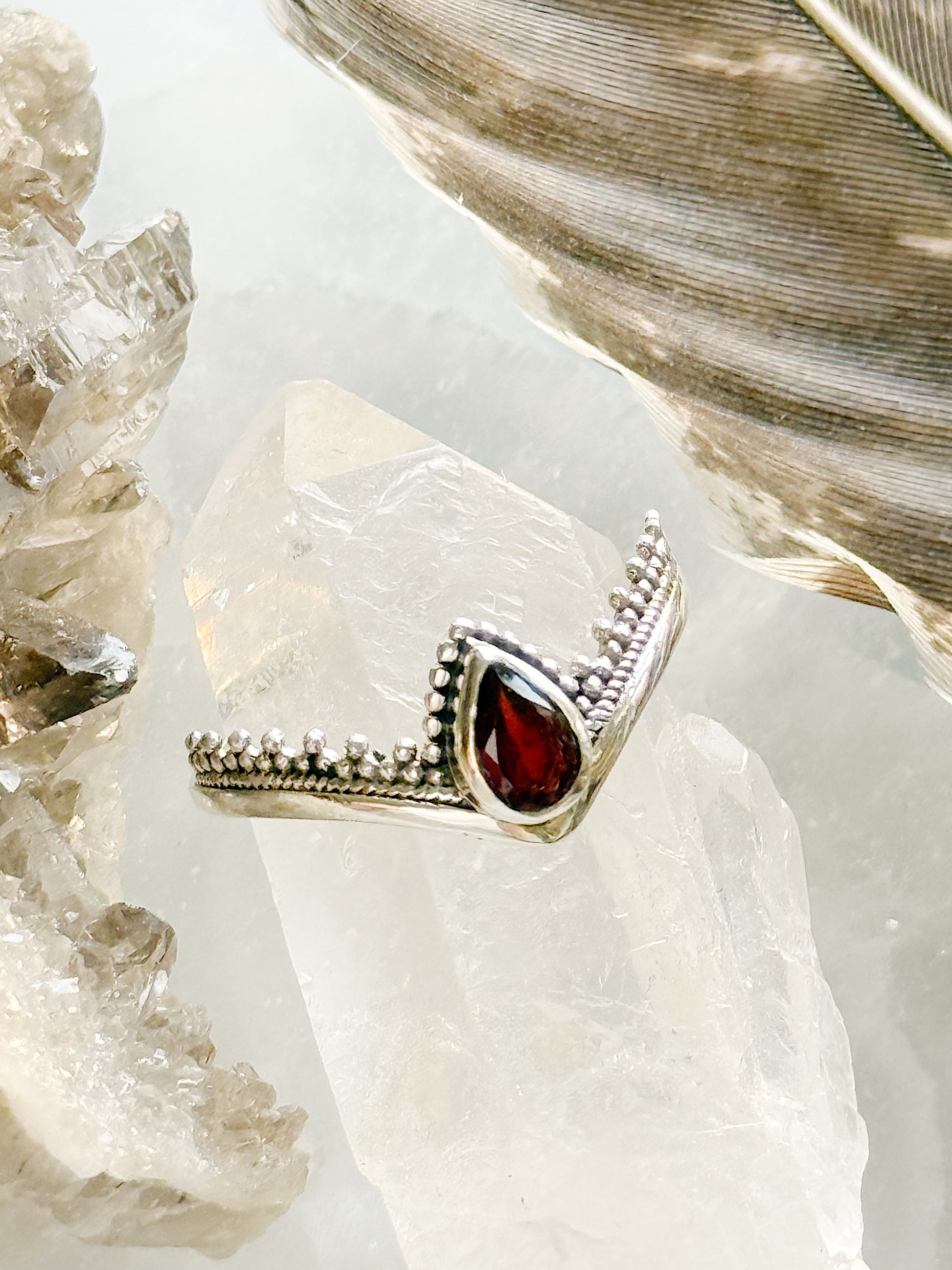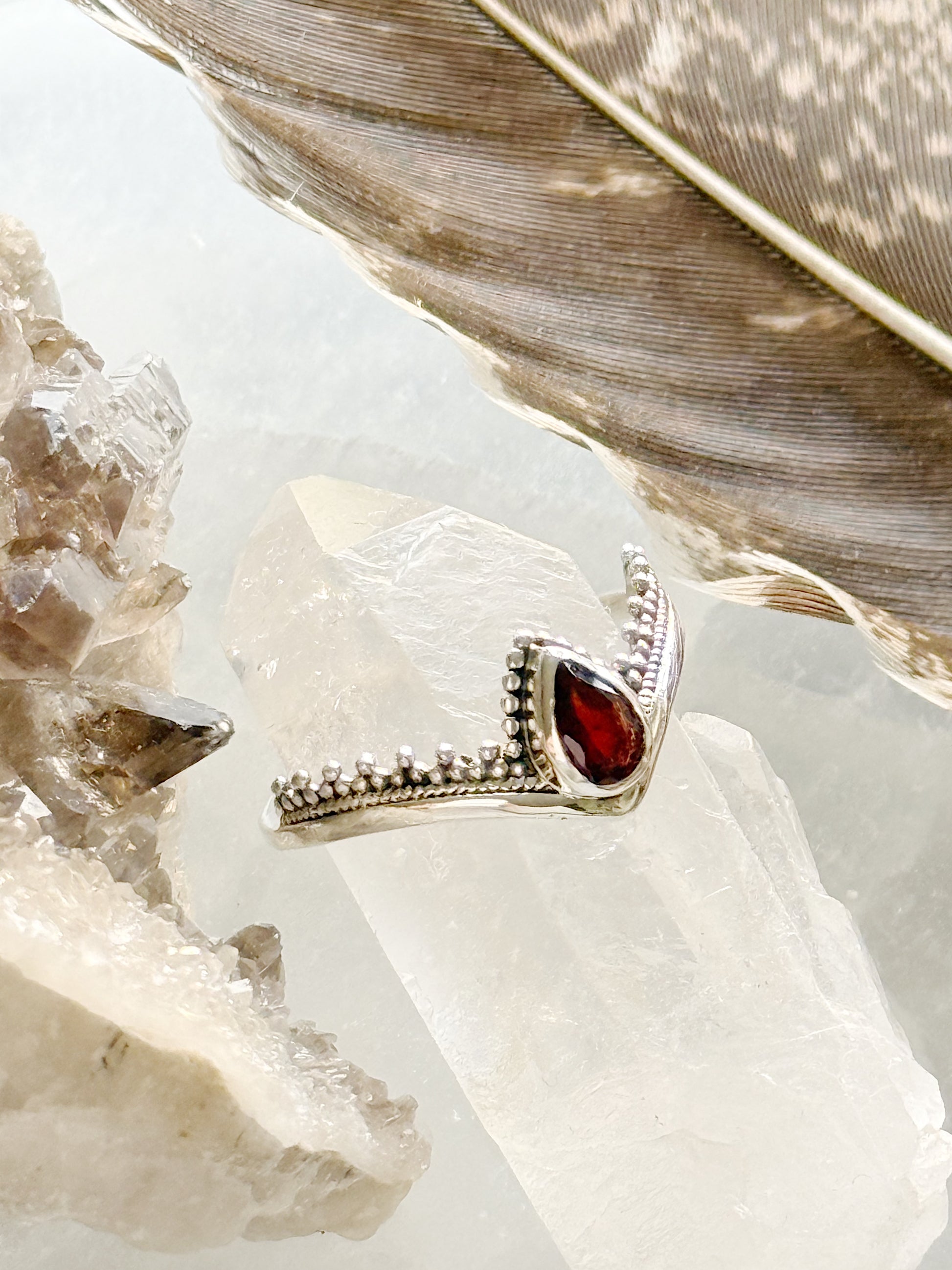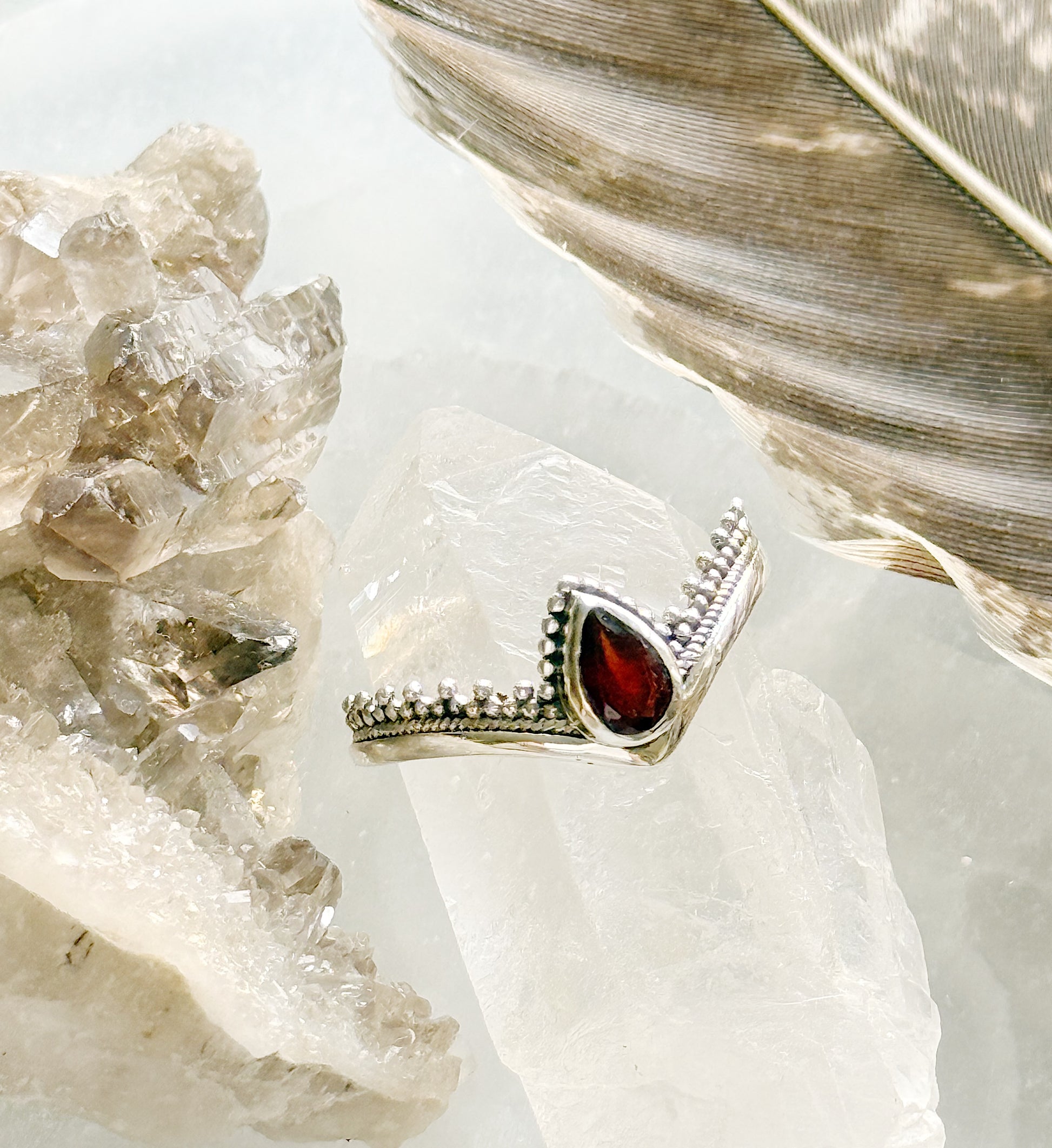 Išskirtinis sidabrinis žiedas su granato kristalu.
