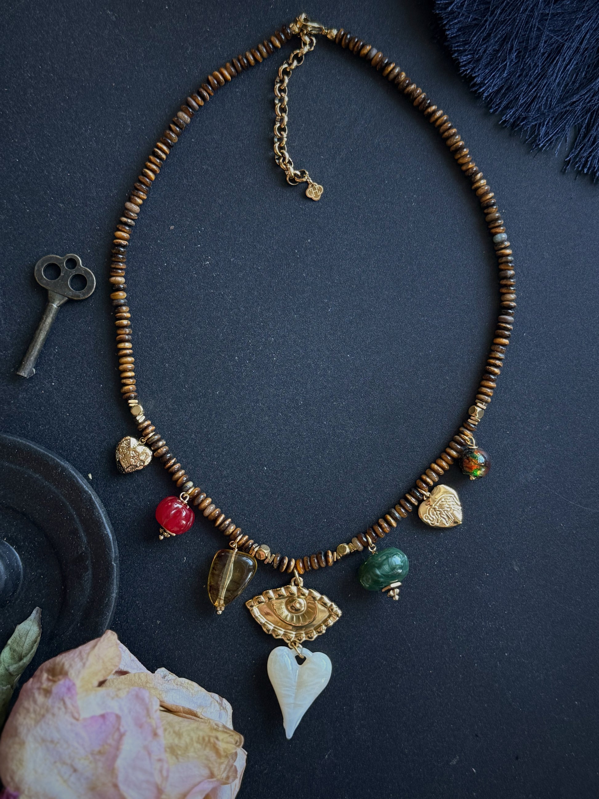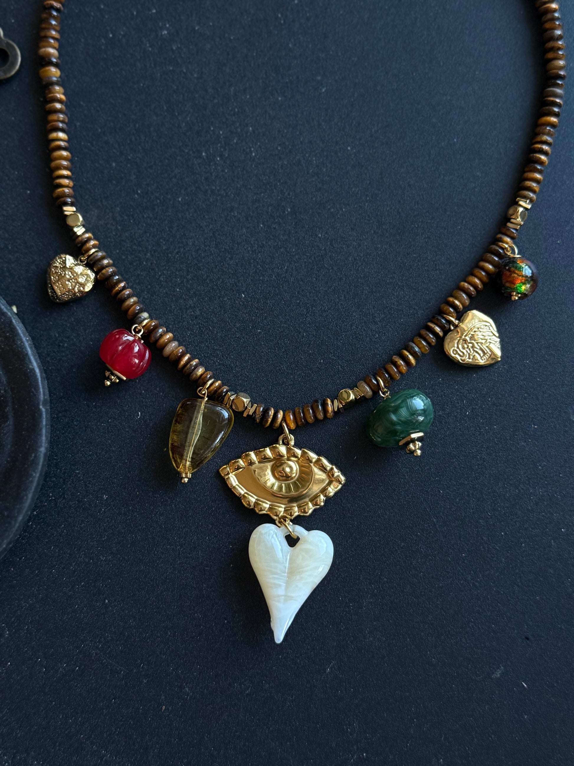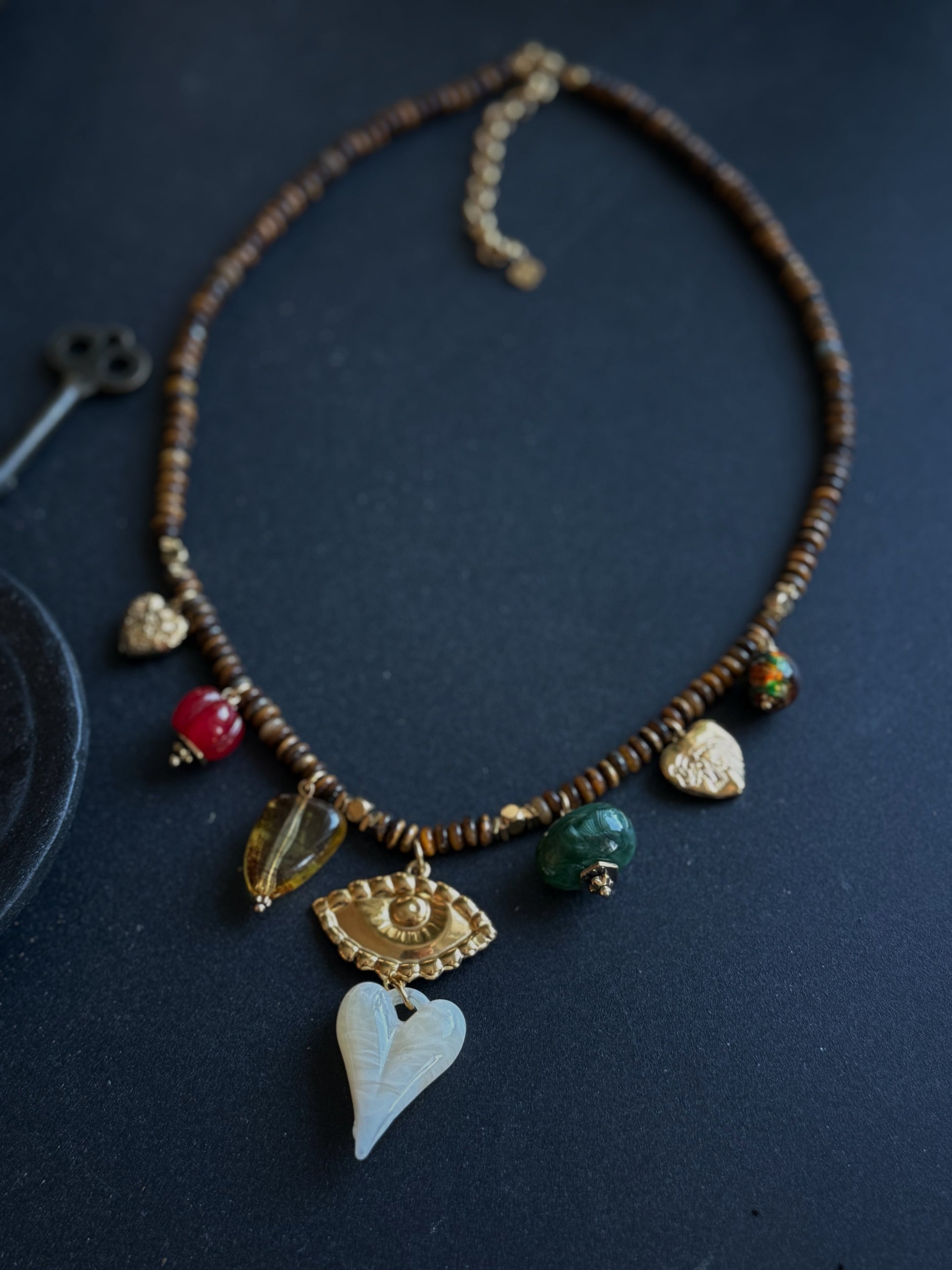 Vėrinį puošia simbolinės detalės: širdies formos pakabukas, primenantis ryšį su širdimi, bei akies simbolis – intuicijos ir vidinės išminties ženklas. Spalvoti akcentai suteikia papuošalui gyvybės ir išskirtinumo.
