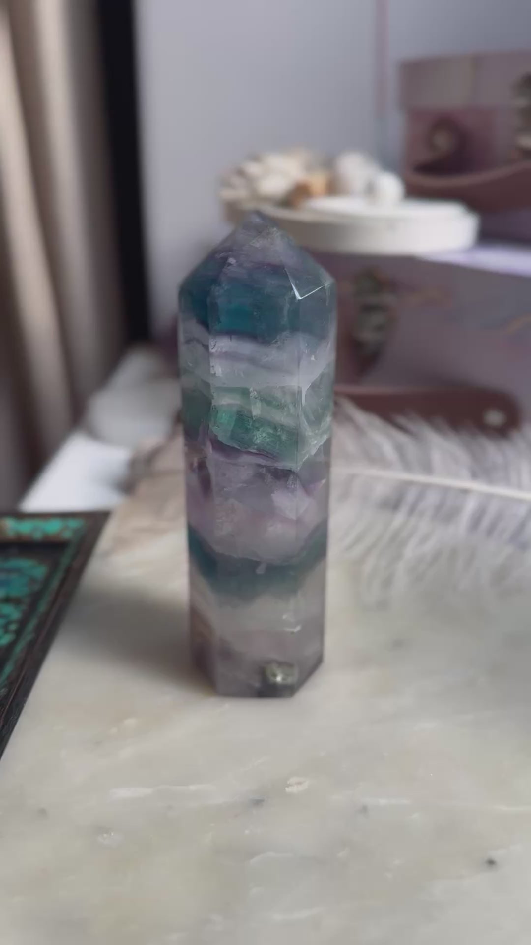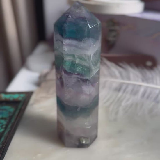 Vaivorykštinis Fluoritas - padeda susikoncentruoti, apsisaugoti nuo neigiamos įtakos, išgryninti savo tikslus. Padeda mokytis ir išlaikyti aštrų protą, pamatyti situacijas iš aukščiau, visą paveikslą, todėl tinka pasidėti šalia mokinantis ar darbo vietoje. Taip pat šis kristalas laikomas vienu galingiausių norint išvalyti, subalansuoti žmogaus auros lauką. Padeda nuo įtampos, nerimo, galvos skausmo.